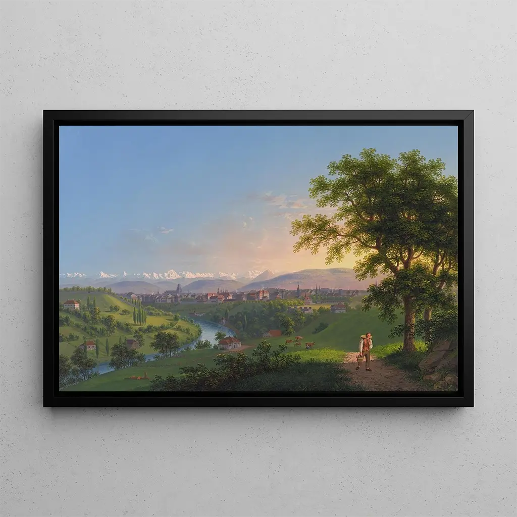 Berne : een romantisch beeld van de Zwitserse landschappen De kunstdruk van Bern, gemaakt door Johann Heinrich Bleuler de Jonge, brengt ons naar het hart van een idyllisch landschap. Met zijn zachte tinten en nuances van groen slaagt de kunstenaar erin de sereniteit van de oevers van de rivier de Aare vast te leggen. De minutieuze details van de historische gebouwen, gecombineerd met de majesteit van de bergen op de achtergrond, creëren een rustgevende en contemplatieve sfeer. De olieverftechniek stelt Bleuler in staat te spelen met het licht, waardoor de reflecties op het water worden benadrukt en deze landelijke scène tot leven komt. Elke penseelstreek lijkt een verhaal te vertellen en nodigt de kijker uit om zich onder te dompelen in dit schilderij. Johann Heinrich Bleuler de Jonge: een meester van het romantische landschap Johann Heinrich Bleuler de Jonge, actief in de 19e eeuw, wordt erkend om zijn landschappen die de natuurlijke schoonheid van Zwitserland vieren. Geïnspireerd door de romantische beweging, past hij zich aan een artistieke traditie aan die emotie en persoonlijke expressie waardeert. Zijn werken weerspiegelen een diepe verbondenheid met de natuur, vaak gekenmerkt door een sfeer van melancholie en contemplatie. Bleuler slaagde erin de essentie van de plaatsen die hij schilderde vast te leggen, waardoor hij een onmisbare kunstenaar van zijn tijd werd. Zijn nalatenschap blijft bestaan, en zijn kunstdrukken blijven degenen inspireren die hun leefruimte willen verfraaien met scènes vol poëzie. Een decoratief stuk met vele voordelen De kunstdruk van Bern is een decoratief stuk dat harmonieus integreert in diverse ruimtes, of het nu een woonkamer, kantoor of slaapkamer is. De afdrukkwaliteit garandeert een opmerkelijke trouw aan de kleuren en details van het originele werk, waardoor u dagelijks kunt genieten van de esthetiek van Bleuler. Dit schilderij, met zijn rustige sfeer, brengt een vleugje rust en verfijning in uw interieur. Door voor dit doek te kiezen, kiest u voor een kunstwerk dat niet alleen uw decor verfraait, maar ook uitnodigt tot reflectie en ontsnapping, waardoor elk blikmoment een moment van contemplatie wordt.