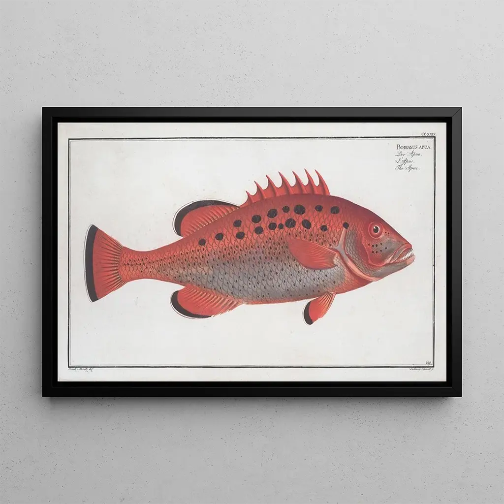 Bodianus apua L'Apue : een ode aan de waterige schoonheid De kunstdruk van Bodianus apua, algemeen bekend als L'Apue, is een ware eerbetoon aan de rijkdom van de onderwaterwereld. Dit schilderij, vervaardigd met een delicate aquareltechniek, benadrukt levendige kleuren die variëren van het diepe blauw van de oceanen tot de schitterende tinten van koraal. De kunstenaar heeft de essentie van deze tropische vis weten vast te leggen, met minutieuze details die de textuur van zijn schubben en de vloeiendheid van zijn bewegingen onthullen. De sfeer die uit dit werk straalt, is zowel rustgevend als fascinerend, en nodigt de kijker uit om onder te dompelen in een levendige onderwaterwereld. Marcus Elieser Bloch : een pionier in artistieke ichthyologie Marcus Elieser Bloch, geboren in 1723, wordt erkend als een van de eerste kunstenaars die kunst en wetenschap combineerden in de ichthyologie. Zijn werk, dat zich over meerdere decennia uitstrekt, werd beïnvloed door zijn reizen en ontmoetingen met naturalisten uit zijn tijd. Bloch wist wetenschappelijk realisme te combineren met een verfijnde esthetiek, waardoor zijn visafbeeldingen niet alleen informatief, maar ook artistiek waren. Via zijn illustraties heeft hij bijgedragen aan een beter begrip van mariene soorten, en wordt hij beschouwd als een iconische figuur uit de 18e eeuw in de wereld van kunst en wetenschap. Een decoratief stuk met vele voordelen De kunstdruk van Bodianus apua is veel meer dan een eenvoudig kunstwerk; het is een decoratief element dat zijn plek vindt in diverse woonruimtes. Of het nu in een modern salon, een inspirerend kantoor of een rustgevende slaapkamer is, dit doek brengt een vleugje elegantie en sereniteit. De afdrukkwaliteit garandeert een opmerkelijke trouw aan de kleuren en details van het origineel, waardoor elk bliksemmoment een moment van contemplatie wordt. De esthetische aantrekkingskracht van deze kunstdruk maakt het een ideale keuze voor wie zijn interieur wil verrijken met een stuk dat de natuurlijke schoonheid van de oceanen oproept.