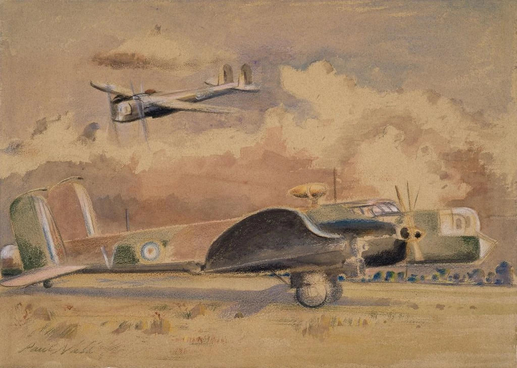 Paul Nash, geboren in 1889, is een van de meest invloedrijke Britse kunstenaars van de 20e eeuw, bekend om zijn indringende representaties van de oorlog. Zijn ervaring als soldaat tijdens de Eerste Wereldoorlog heeft zijn werk diep beïnvloed, waardoor hij de thema's van vernietiging en herinnering ging verkennen. Via doeken zoals Bombardiers Whitley au Soleil wist Nash de brutaliteit van het conflict te vertalen, terwijl hij de schoonheid van landschappen benadrukte. Zijn stijl, die elementen van surrealisme en realisme combineert, heeft een onuitwisbare stempel gedrukt op de kunstgeschiedenis en maakt hem tot een essentiële getuige van zijn tijd.