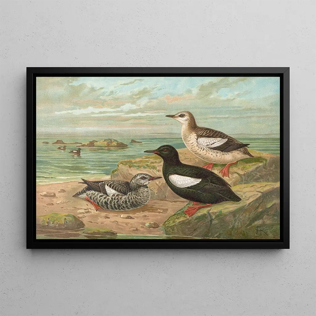 De kunstdruk van Cepphus grylle L Gryllteiste, vervaardigd door Johann Friedrich Naumann, dompelt ons onder in een betoverende maritieme wereld. Dit schilderij benadrukt een vogel met donkere verenkleding, contrasterend met de tinten blauw en grijs van de oceaan. De aquareltechniek, met finesse toegepast, brengt de lichtheid van de vogel over terwijl ze de diepte van het water benadrukt. De sfeer die uit dit werk straalt, roept de rust van de kusten op, terwijl de kracht van de natuur zichtbaar blijft. Elke penseelstreek lijkt een vluchtig moment vast te leggen, een uitnodiging om de wilde schoonheid van de dierenwereld te bewonderen.