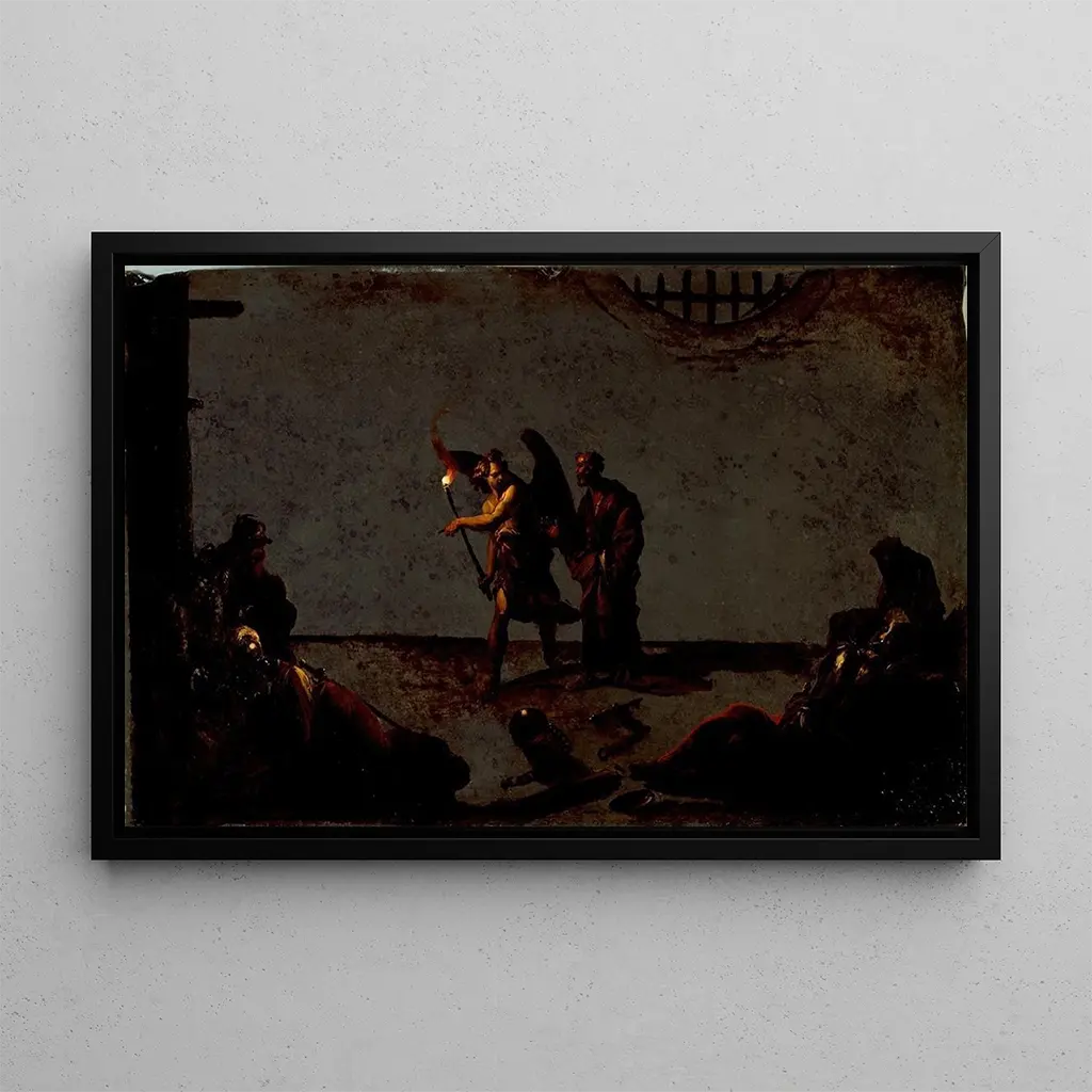 De La Libération de Saint Pierre, een iconisch werk van Leonaert Bramer, dompelt ons onder in een bijbelse scène vol sereniteit en mysterie. De compositie, rijk aan details, benadrukt de centrale figuur, Sint Pieter, omringd door een zachte lichtstraal die zijn gezicht verlicht. De warme kleuren, variërend van goud tot bruin, creëren een rustgevende sfeer, terwijl de schaduwen een indrukwekkende diepte aan de scène toevoegen. Bramer's techniek, die realisme combineert met dramatische elementen, nodigt de kijker uit om de intensiteit van dit moment van goddelijke bevrijding te voelen.