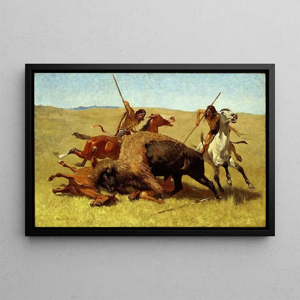 Frederic Remington, actief aan het einde van de 19e eeuw, is beroemd om zijn weergaven van het leven in het Amerikaanse Westen. Geïnspireerd door zijn reizen en ontmoetingen met de inheemse volkeren, wist hij de cultuur, fauna en flora van deze regio vast te leggen. Zijn stijl, die realisme en romantiek combineert, heeft het beeld gevormd dat wij tegenwoordig van het wilde Westen hebben. "De jacht op bizons" is een van zijn iconische kunstdrukken, die zijn inzet toont om scènes uit het grensleven te vereeuwigen en een eerbetoon te brengen aan de majesteit van de natuur.