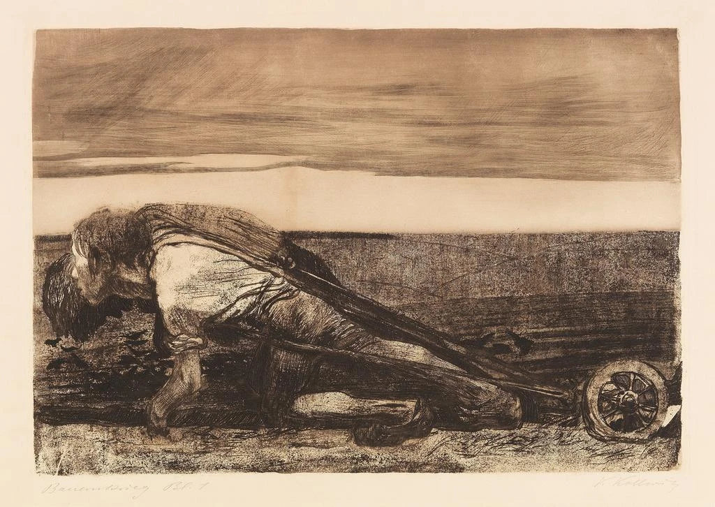 Käthe Kollwitz, artiste allemande du début du XXe siècle, est reconnue pour son engagement social et son humanisme. Influencée par les événements tragiques de son époque, notamment les guerres et les inégalités sociales, elle a consacré sa carrière à représenter la souffrance humaine et la lutte pour la justice. Les Charrues, créée dans un contexte de bouleversements sociaux, illustre parfaitement son désir de donner une voix aux opprimés. Son style, mêlant expressionnisme et réalisme, a laissé une empreinte indélébile dans l’histoire de l’art, faisant d'elle une figure incontournable du mouvement artistique engagé.
