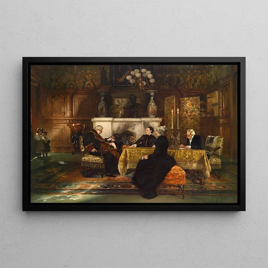 De kunstdruk van De Redactie van het Testament door Christian Ludwig Bokelmann vangt een moment vol emotie en betekenis. Dit schilderij, rijk aan details en uitdrukkingen, beeldt een scène uit waarin personages samenkomen rond een plechtige handeling. De donkere kleuren en het spel van schaduw benadrukken de ernst van het moment, terwijl het licht de gezichten en gebaren van de hoofdpersonen benadrukt. De sfeer is zowel dramatisch als introspectief, en nodigt de kijker uit om na te denken over de thema's leven, dood en menselijke relaties.