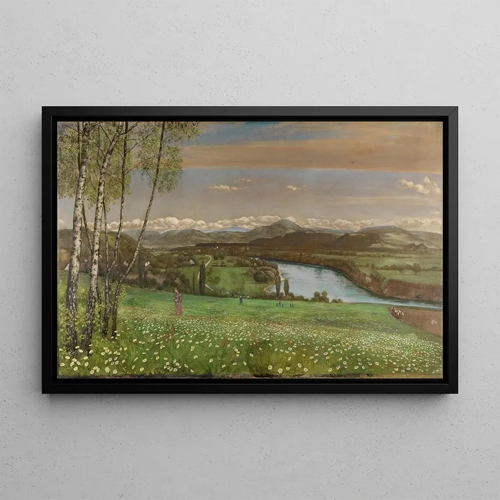 Hans Thoma, né en 1839, est une figure marquante du romantisme allemand. Influencé par les paysages de la Forêt-Noire et les traditions picturales de son époque, il a su développer un style unique qui allie réalisme et poésie. Thoma a souvent exploré les thèmes de la nature et de la spiritualité, cherchant à capturer l'essence même de ses sujets. Sa carrière, s'étendant sur la seconde moitié du XIXe siècle, est marquée par une quête d'authenticité et une volonté de rendre hommage à la beauté du monde naturel. La Vallée du Rhin près de Säckingen en est un parfait exemple, illustrant son habileté à marier technique et émotion.