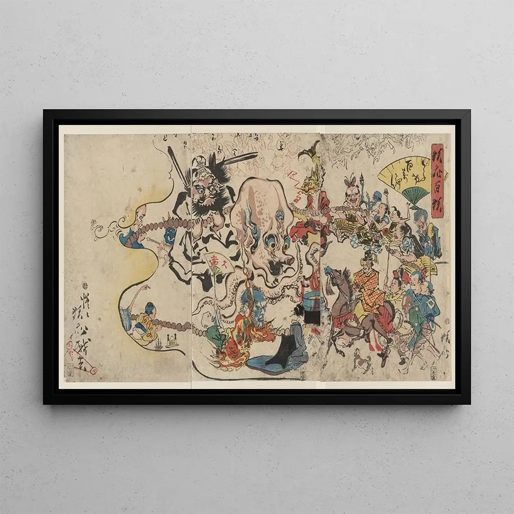 De kunstdruk Dke Hyakumanben van Kawanabe Kyōsai is een levendig werk dat een veelheid aan personages en scènes uit het dagelijks leven in Japan oproept. De heldere kleuren en de minutieuze details dompelen de kijker onder in een rijk universum vol emoties en verhalen. De houtsnede-techniek, typisch voor de Edo-periode, stelt de kunstenaar in staat te spelen met licht en schaduw, waardoor een dynamische en levendige sfeer ontstaat. Elke figuur, elke beweging lijkt een verhaal te vertellen, uitnodigend tot contemplatie en persoonlijke interpretatie.