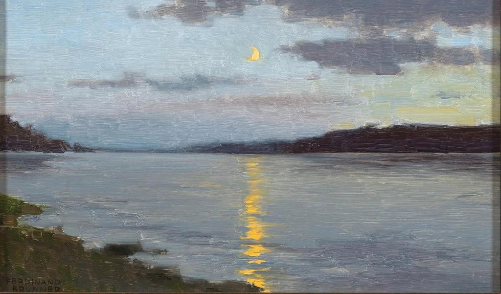 Ferdinand Brunner, actief aan het einde van de 19e eeuw, wordt vaak geassocieerd met de romantische beweging, die emotie en natuur waardeert. Hoewel minder bekend dan sommige van zijn tijdgenoten, heeft Brunner zich weten te onderscheiden met zijn nachtlandschappen vol mysterie en schoonheid. Zijn werken, beïnvloed door de grote meesters van het romantisme, verkennen de thema's licht en duisternis, en creëren betoverende sferen. Door zijn werk nodigt Brunner de kijker uit om de magie van de sterrennacht en de rust van natuurlijke landschappen te voelen, en getuigt hij van een tijd waarin kunst probeerde diepe en persoonlijke gevoelens uit te drukken.