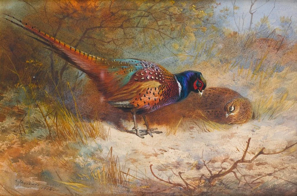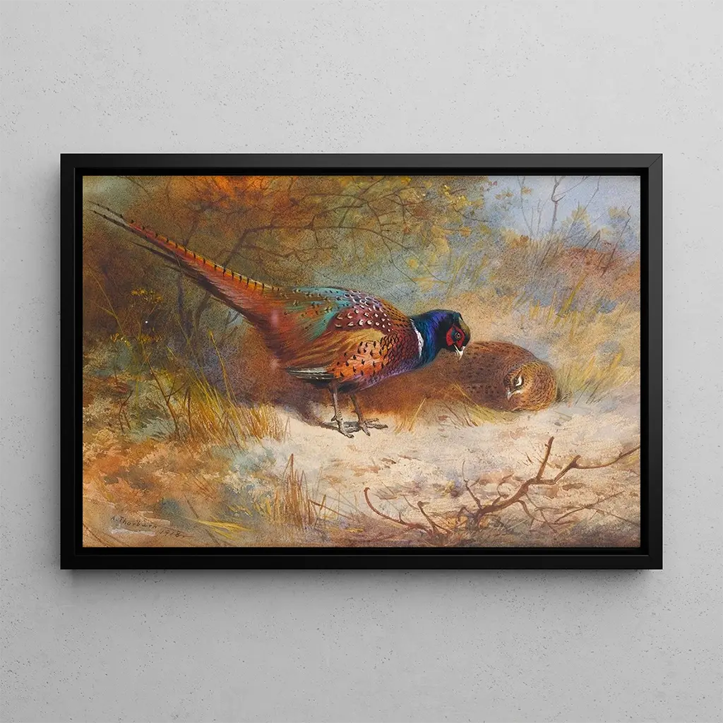 Faisans : een viering van de wilde natuur De kunstdruk van het werk "Faisans" van Archibald Thorburn dompelt ons onder in een levendige wereld waar de fauna tot leven komt. De fonkelende kleuren van de veren, variërend van smaragdgroen tot stralend goud, mengen zich harmonieus met een natuurlijke achtergrond, die de rust van een ochtend op het platteland oproept. De aquareltechniek, beheerst door Thorburn, geeft het werk een lichtheid en vloeiendheid die de gracieuze beweging van de vogels vastleggen. Elk detail, van de delicate veren tot de weerspiegelingen van het licht, nodigt uit tot een aandachtige beschouwing en onthult de vergankelijke schoonheid van deze majestueuze wezens. Archibald Thorburn : de naturalistische kunstenaar van het begin van de 20e eeuw Archibald Thorburn, geboren in 1860, is een Schotse schilder en illustrator die bekend staat om zijn nauwkeurige en poëtische weergaven van de fauna. Geïnspireerd door de naturalistische beweging, wist hij de essentie van dieren in hun natuurlijke habitat vast te leggen. Zijn werk past in een periode waarin de interesse voor de natuur en het behoud van de fauna toenam. Thorburn werkte samen met publicaties zoals "The Field" en droeg bij aan werken over ornithologie, waardoor hij zijn status als expert op dat gebied versterkte. Zijn artistieke nalatenschap blijft bestaan en inspireert natuurliefhebbers en hedendaagse kunstenaars. Een decoratief stuk met vele voordelen De kunstdruk van het schilderij "Faisans" is een ideaal decoratief stuk om je interieur te verrijken, of het nu in een woonkamer, kantoor of slaapkamer is. De kwaliteit van de afdruk en de trouwheid van de kleuren maken het een aantrekkelijke keuze voor wie een vleugje natuur aan hun decor willen toevoegen. Dit kunstwerk trekt de aandacht en stimuleert gesprekken, terwijl het een rustgevende en elegante sfeer brengt. Door voor deze doek te kiezen, kiest u voor een werk dat esthetiek en passie voor fauna combineert, en uw ruimte transformeert in een waar heiligdom van natuurlijke schoonheid.