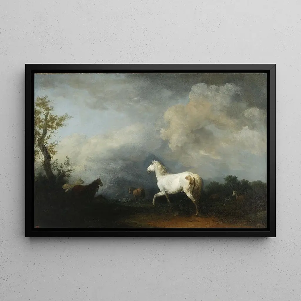 Groep paarden: een wilde dans van de natuur In deze kunstdruk van het schilderij "Groep paarden" vangt Francesco Giuseppe Casanova de ruwe energie en de majestueuze schoonheid van de paarden. De paarden, afgebeeld in een dynamische beweging, lijken bijna tot leven te komen onder de penseelstreken. De aardse kleuren en de nuances van bruin en zwart mengen harmonieus, waardoor een sfeer ontstaat die zowel wild als sereen is. De techniek van Casanova, die realisme en impressionisme combineert, stelt de kijker in staat de kracht en gratie van deze dieren te voelen, terwijl het ook een uitnodiging is tot contemplatie van de natuur. Francesco Giuseppe Casanova: een meester van de dierenbeweging Francesco Giuseppe Casanova, actief in de achttiende eeuw, wordt erkend om zijn werken die de schoonheid van dieren, vooral paarden, benadrukken. Geïnspireerd door de barokke stroming, wordt zijn stijl gekenmerkt door een minutieuze aandacht voor details en een vermogen om de essentie van zijn onderwerpen vast te leggen. Casanova heeft zich weten te vestigen in de kunstwereld dankzij zijn diepgaand begrip van vorm en beweging, wat hem in staat stelde dynamische en levendige composities te creëren. Zijn werk weerspiegelt de tijd waarin de natuur en de realistische weergave van dieren centraal stonden in artistieke bezigheden. Een decoratief stuk met vele voordelen De kunstdruk van "Groep paarden" is een decoratief stuk dat elk interieur kan verrijken, of het nu in een woonkamer, kantoor of slaapkamer is. De kwaliteit van de afdruk en de trouw aan het originele werk garanderen een indrukwekkend esthetisch resultaat. Dit schilderij trekt de aandacht en stimuleert gesprekken, terwijl het een vleugje wilde natuur toevoegt aan je inrichting. Door te kiezen voor deze doek, ga je voor een decoratief element dat schoonheid, geschiedenis en passie voor dierenkunst combineert, waardoor je ruimte een unieke en inspirerende plek wordt.