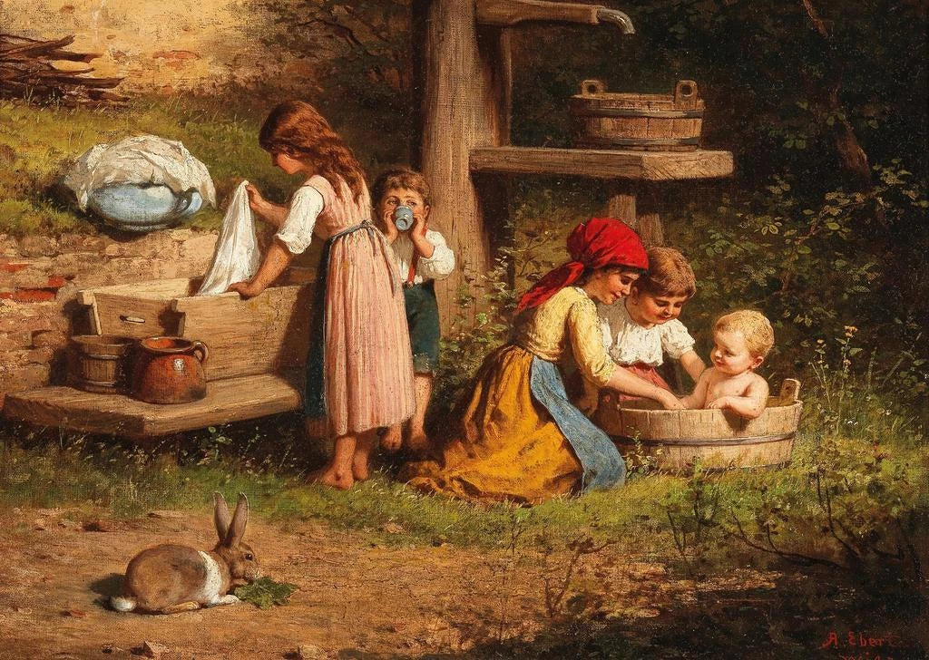 Enfants à la fontaine, au verso anciennement titré : une tendresse intemporelle "Enfants à la fontaine, au verso anciennement titré" van Anton Ebert is een kunstdruk die de onschuldige vreugde van de kindertijd oproept. Het doek toont kinderen die spelen rond een fontein, en legt een moment van eenvoudige en pure gelukzaligheid vast. De pastelkleuren, zacht en helder, creëren een serene en uitnodigende sfeer. De fijne details van de gezichten en kleding van de kinderen getuigen van Ebert's talent om leven en emotie op het doek te brengen. Deze scène, doordrenkt met nostalgie, nodigt uit om de geneugten van de kindertijd en het belang van gedeelde momenten te herinneren. Anton Ebert: een meester van het genre schilderen Anton Ebert, een Duitse schilder uit de 19e eeuw, wordt erkend om zijn werken die het dagelijks leven en de thema's van de kindertijd vieren. Geïnspireerd door de romantische beweging, specialiseerde hij zich in genre scènes, waarin hij de schoonheid van menselijke interacties wist vast te leggen. Zijn carrière werd gekenmerkt door een bijzondere aandacht voor details en een gevoeligheid voor zijn onderwerpen. "Enfants à la fontaine" illustreert perfect zijn stijl, die realisme en tederheid combineert, en getuigt van zijn vaardigheid om levendige momenten vol emotie te vereeuwigen. Een decoratief stuk met vele voordelen Deze kunstdruk van "Enfants à la fontaine" is een decoratief stuk dat een vleugje zachtheid en charme aan uw interieur zal toevoegen. Ideaal voor een woonkamer, een kinderkamer of zelfs een kantoor, zal deze doek uw ruimte opfleuren en tegelijkertijd een warme sfeer creëren. De kwaliteit van de afdruk garandeert een opmerkelijke fideliteit aan de nuances en details van het originele werk, waardoor deze kunstdruk een esthetische en tijdloze keuze is. Door dit kunstwerk in uw decoratie te integreren, kiest u niet alleen voor een visueel element, maar ook voor een uitnodiging tot dromen en het contempleren van de kindertijd.