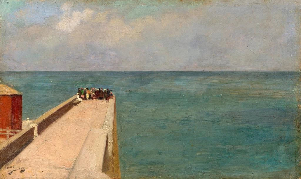 André Devambez, Franse schilder actief aan het einde van de 19e en het begin van de 20e eeuw, staat bekend om zijn voorstellingen van het dagelijks leven en genre-scènes. Geïnspireerd door de impressionistische beweging, wist hij moderniteit te integreren in zijn werken, terwijl hij een realistische benadering behield. Zijn carrière werd gekenmerkt door een verkenning van maritieme thema's, waarin hij vaak het havenleven en buitenactiviteiten afbeeldde. "De jetée" illustreert perfect zijn talent om momenten van het leven vast te leggen, terwijl het ook de groeiende betekenis van de zee in de Franse cultuur van die tijd aantoont. Devambez wist scènes te vereeuwigen die nog steeds resoneren.