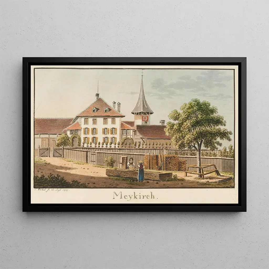 De kunstdruk "Meykirch" van Jakob Samuel Weibel brengt ons in een landelijk landschap vol charme en rust. Dit doek roept een idyllisch tafereel op, waar natuur en architectuur harmonieus samenkomen. De zachte, aardse kleuren, gecombineerd met accenten van groen en blauw, creëren een rustgevende, bijna nostalgische sfeer. De compositie benadrukt elementen uit het dagelijks leven en nodigt de kijker uit om zich onder te dompelen in de eenvoudige schoonheid van deze bevroren momenten in de tijd. "Meykirch" is een ode aan het landelijke leven, en viert de schoonheid van het landschap en tradities.