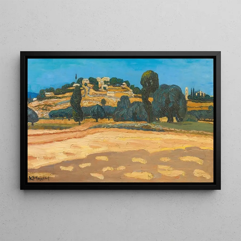 De kunstdruk Naxos van Konstantinos Maleas brengt ons naar het hart van de betoverende landschappen van de Egeïsche Zee. De tinten blauw, die harmonieus mengen met groene en zandkleurige accenten, roepen een sfeer van sereniteit en contemplatie op. De impressionistische techniek van Maleas, gekenmerkt door vrije en expressieve penseelstreken, brengt dit doek tot leven en creëert een gevoel van beweging en licht. Elk element, van de golven tot de heuvels, lijkt te vibreren onder de stralende zon, en nodigt de kijker uit om onder te dompelen in deze idyllische scène.