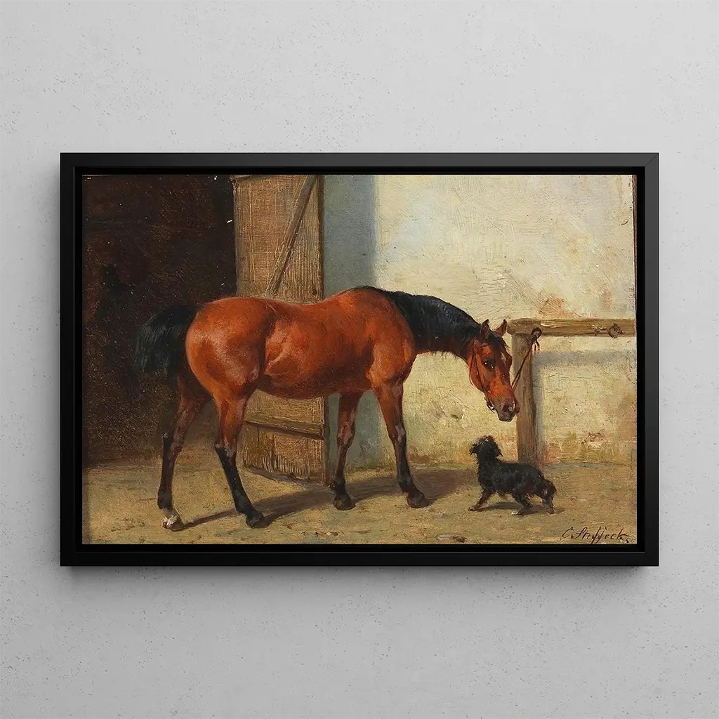 Een goede vriend: een portret van menselijke verbondenheid De kunstdruk van Een goede vriend, gemaakt door Carl Steffeck, illustreert teder de relatie tussen de mens en zijn trouwe viervoeter. Dit doek, rijk aan warme kleuren en expressieve details, vangt een moment van verbondenheid en zachtheid. De oplettende blik van de hond, gecombineerd met de ontspannen houding van zijn eigenaar, roept een sfeer van vertrouwen en genegenheid op. Steffeck slaagt er met zijn vaardige techniek in om een voelbare emotie over te brengen, waardoor dit werk bijzonder ontroerend is. Elke penseelstreek lijkt een verhaal te vertellen, dat van een onbreekbare band tussen mens en dier. Carl Steffeck: een meester van affectief realisme Carl Steffeck, een Duitse schilder uit de 19e eeuw, is beroemd om zijn portretten en genretaferelen die de menselijke en dierlijke relaties benadrukken. Werkend binnen een artistieke context die gekenmerkt wordt door het realisme, liet hij zich inspireren door het dagelijks leven en sociale interacties om werken vol emotie te creëren. Steffeck wist de schoonheid van eenvoudige momenten vast te leggen, waardoor hij een gewaardeerde kunstenaar werd, zowel door zijn tijdgenoten als door latere generaties. Zijn stijl, gekenmerkt door een minutieuze aandacht voor details en een palet van warme kleuren, droeg bij aan zijn bekendheid in de kunstwereld. Een decoratief stuk met vele voordelen De kunstdruk van Een goede vriend is een decoratief stuk dat harmonieus integreert in diverse interieurs, of het nu in een woonkamer, entree of kantoor is. De afdrukkwaliteit garandeert een opmerkelijke trouw aan het originele werk, waardoor elke nuance en uitdrukking gewaardeerd kan worden. Door dit schilderij aan uw decoratie toe te voegen, brengt u een vleugje warmte en gezelligheid, terwijl u de unieke band tussen mens en huisdier viert. Dit doek, met zijn tijdloze charme, zal dierenliefhebbers en kunstliefhebbers aanspreken, en elke blik een moment van gedeeld geluk maken.
