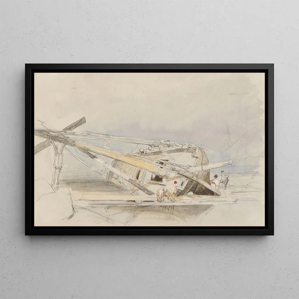 Vlot gestrandet: een scène van maritieme wanhoop Het werk "Vlot gestrandet" van Clarkson Stanfield roept een melancholische sfeer op waarin de natuur haar rechten heroverd op de mens. In dit doek overheersen donkere kleuren en grijstinten, wat een opvallend contrast creëert met de lichtstralen die door de wolken breken. De compositie benadrukt een schip dat op het strand is gestrand, omringd door woelige golven en rotsen, symboliserend de strijd tussen de mens en de krachten van de zee. Stanfield's techniek, die realisme en romantiek combineert, nodigt de kijker uit om de kracht van de natuur te voelen terwijl hij de kwetsbaarheid van het menselijk bestaan aanschouwt. Clarkson Stanfield: een meester van het maritieme landschap Clarkson Stanfield, actief in de 19e eeuw, wordt erkend om zijn maritieme voorstellingen die de schoonheid en de gevaarlijkheid van de zee vastleggen. Geïnspireerd door de romantische beweging, wist hij precisie en emotionele gevoeligheid te combineren. Zijn werk valt binnen een periode waarin landschapsschilderkunst een opleving doormaakte, en hij onderscheidt zich door zijn vermogen om dramatische sferen over te brengen. Stanfield was ook een toneelschilder, wat zijn visuele aanpak heeft verrijkt. Zijn werken, waaronder "Vlot gestrandet", getuigen van het belang van de zee in de collectieve verbeelding van zijn tijd. Een decoratief stuk met vele voordelen De kunstdruk van "Vlot gestrandet" is een decoratief stuk dat uw interieur zal verrijken, of het nu in een woonkamer, kantoor of slaapkamer is. De hoge kwaliteit van de afdruk maakt het mogelijk om de diepte en textuur van het originele werk te voelen, terwijl het een vleugje elegantie aan uw inrichting toevoegt. Dit schilderij, met zijn onmiskenbare esthetische aantrekkingskracht, nodigt uit tot reflectie en ontsnapping, waardoor elke blik een nieuwe ontdekking wordt. Geef uw ruimte een unieke sfeer met dit doek dat kunst en emotie combineert.
