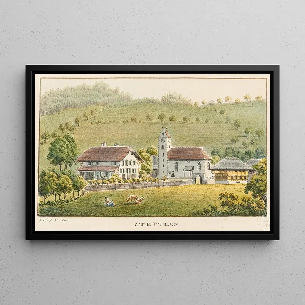 Stettlen : een ode aan de rustige natuur In deze kunstdruk van Stettlen brengt Jakob Samuel Weibel ons naar een idyllisch landschap waar sereniteit de boventoon voert. De zachte tinten groen en blauw mengen harmonieus, en roepen een sfeer van rust en kalmte op. De aquareltechniek, met haar delicate nuances, maakt het mogelijk om het licht op subtiele wijze vast te leggen, waardoor een bijna etherisch effect ontstaat. Elk detail, van majestueuze bomen tot de reflecties in het water, draagt bij aan een compositie die uitnodigt tot contemplatie en ontsnapping. Dit schilderij is een ware open raam naar een vredige wereld, waar de tijd lijkt stil te staan. Jakob Samuel Weibel : een meester van het romantische landschap Jakob Samuel Weibel, actief in de 19e eeuw, is een Zwitserse kunstenaar wiens werk binnen de romantische beweging past. Geïnspireerd door de natuurlijke schoonheid van zijn geboorteland, wist hij de essentie van Zwitserse landschappen met een unieke gevoeligheid vast te leggen. Zijn carrière, hoewel minder bekend dan die van sommige tijdgenoten, heeft een significante stempel gedrukt op de landschapskunst. De werken van Weibel worden vaak gekenmerkt door een minutieuze aandacht voor details en een kleurenpalet dat het natuurlijke licht oproept. Door deze kunstenaar opnieuw te ontdekken, duik je in een tijdperk waarin de natuur werd gevierd als een bron van inspiratie en schoonheid. Een decoratief kunstwerk met vele voordelen De kunstdruk van Stettlen is een ideale keuze om je interieur te verfraaien, of het nu in een woonkamer, kantoor of slaapkamer is. De hoge kwaliteit van de afdruk en de esthetische aantrekkingskracht maken het een pronkstuk dat de aandacht trekt en bewondering oproept. Door dit schilderij in je inrichting te integreren, breng je een vleugje natuur en sereniteit in je leefruimte. De zachtheid van de kleuren en de fijnheid van de details creëren een rustgevende sfeer, perfect om op te laden. Kiezen voor deze doek betekent kiezen voor een kunstwerk dat niet alleen decoreert, maar ook uitnodigt tot contemplatie en dromerigheid.