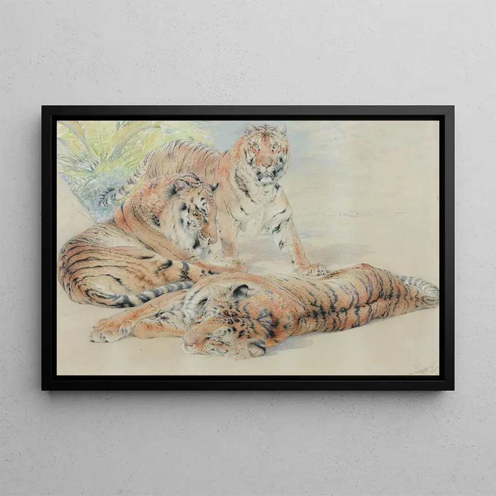 Studie van tijgers: een blik op de katachtige majesteit De kunstdruk "Studie van tijgers" van William Huggins vangt de kracht en gratie van deze majestueuze katachtigen. De warme, aardse kleuren, gemengd met accenten van zwart en oranje, roepen zowel de warmte van hun natuurlijke habitat als de brute kracht van deze wezens op. De techniek van de kunstenaar, die realisme combineert met een vleugje expressionisme, maakt het mogelijk de intensiteit van de blikken van de tijgers te voelen. In deze compositie is elk detail, van de strepen tot de uitpuilende spieren, zorgvuldig weergegeven, waardoor een sfeer ontstaat die zowel wild als boeiend is. William Huggins: een meester in dierenrealisme William Huggins, actief in de 19e eeuw, wordt erkend om zijn voorstellingen van dieren, vooral katachtigen. Geïnspireerd door de wetenschappelijke verkenningen van zijn tijd, wist hij kunst en nauwkeurige observatie van de natuur te combineren. Huggins stond vaak in contact met naturalisten en zoölogen, wat zijn begrip van diergedrag heeft verrijkt. Zijn stijl, geworteld in het realisme, markeerde een periode waarin de fascinatie voor de wilde fauna op haar hoogtepunt was. De kunstdruk "Studie van tijgers" getuigt van zijn vaardigheid om niet alleen de verschijning, maar ook de essentie van deze wezens vast te leggen. Een decoratief stuk met vele voordelen Kiezen voor de kunstdruk "Studie van tijgers" in uw interieur betekent kiezen voor een doek dat een vleugje exotisme en verfijning brengt. Of het nu in een woonkamer, kantoor of slaapkamer is, deze afbeelding trekt de aandacht en wekt bewondering. De afdrukkwaliteit garandeert een nauwkeurigheid in de details van het originele werk, terwijl het een moderne esthetiek biedt. Door deze kunstdruk in uw decoratie te integreren, creëert u een ruimte die de wilde natuur oproept, maar toch chic en elegant blijft.