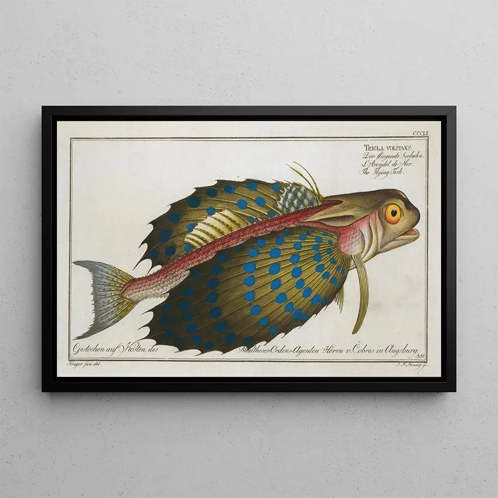 Marcus Elieser Bloch, natuurkundige en illustrator uit de 18e eeuw, wordt erkend om zijn bijdragen aan de illustratie van de zoologie. Zijn werk, "Ichthyologie", heeft de manier waarop vissen werden afgebeeld revolutionair veranderd, door wetenschappelijke precisie te combineren met esthetiek. Bloch reisde door Europa en daarbuiten, geïnspireerd door ontmoetingen met mariene fauna, om werken te creëren die zowel informatief als artistiek zijn. "Trigla volitans" is een perfect voorbeeld van zijn talent, dat niet alleen de schoonheid van de vis vastlegt, maar ook het belang van het behoud van mariene soorten, in een tijd waarin de natuur nog grotendeels onontdekt was.