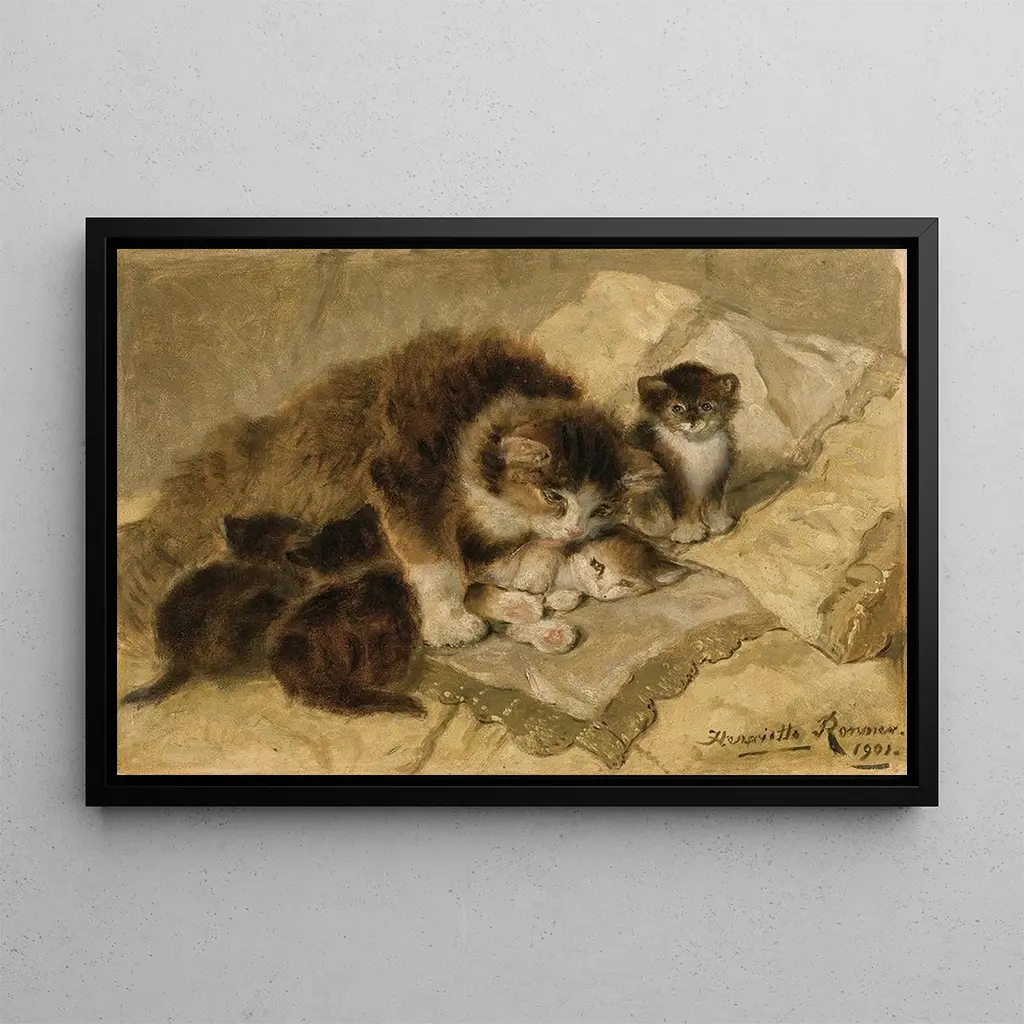 Henriette Ronner-Knip, actief in de 19e eeuw, is vooral bekend om haar voorstellingen van katten en huiselijke scènes. Opgegroeid in een artistieke omgeving, werd ze beïnvloed door de grote meesters van haar tijd en ontwikkelde ze een unieke stijl die realisme en gevoeligheid combineert. Haar vermogen om momenten uit het dagelijks leven vast te leggen, vooral die gerelateerd aan moederschap en natuur, heeft haar internationale erkenning opgeleverd. "Moederlijke trots" illustreert perfect haar talent om emoties op te roepen via eenvoudige maar krachtige composities, waardoor ze een onmisbare figuur is van haar tijd.