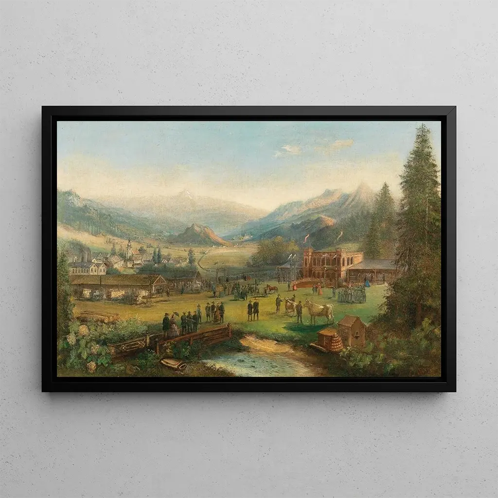 De "Vallée avec usine et bâtiment de fête" van Carl Thöndel toont een landschap waar de natuur en menselijke architectuur in harmonie samenleven. De groengele tinten van de vallei contrasteren met de industriële structuren, waardoor een visueel aantrekkelijke balans ontstaat. De techniek van Thöndel, gekenmerkt door gedetailleerde precisie en subtiel licht, brengt deze scène tot leven, waarbij je bijna het gefluister van de natuur en het gezoem van menselijke activiteit kunt horen. Dit schilderij nodigt uit tot nadenken over de relatie tussen mens en omgeving, terwijl het de schoonheid van het landschap viert.
