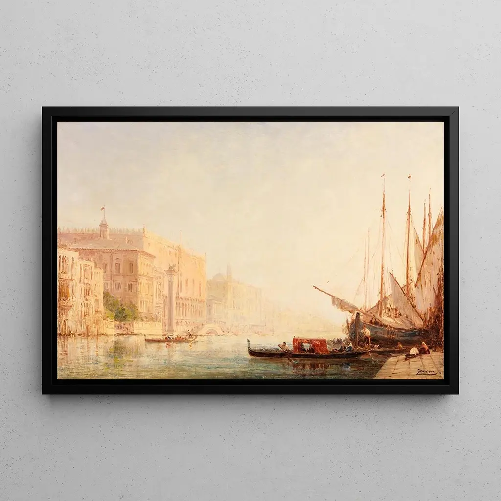 Venetië, kanaalscène: een schilderij doordrenkt met sereniteit De kunstdruk van Venetië, kanaalscène door Félix Ziem brengt de kijker naar het hart van de betoverende kanalen van de Serenissima. De zachte en heldere tinten, die nuances van blauw en goud mengen, roepen de magie op van een zonsondergang op het water. De olieverftechniek, meesterlijk beheerst door Ziem, brengt elke reflectie op het rustige oppervlak van het kanaal tot leven en creëert een rustige en contemplatieve sfeer. De details van de Venetiaanse gebouwen, met hun versierde gevels, voegen een vleugje elegantie toe aan deze scène, en nodigen uit tot dromen en ontsnapping. Félix Ziem: een meester van het romantische landschap Félix Ziem, Franse schilder uit de 19e eeuw, staat bekend om zijn vermogen om het licht en de sfeer van maritieme en stedelijke landschappen vast te leggen. Geïnspireerd door de romantische beweging, wist hij een verfijnde techniek te combineren met een poëtisch gevoel, waardoor zijn werken getuigenissen zijn van zijn tijd. Ziem reisde door Europa, maar het is in Venetië dat hij een onuitputtelijke bron van inspiratie vond. Zijn schilderijen, waaronder Venetië, kanaalscène, getuigen van zijn liefde voor deze iconische stad, terwijl ze de artistieke evoluties van zijn tijd weerspiegelen. Een decoratief stuk met vele voordelen De kunstdruk van Venetië, kanaalscène is een ideaal decoratief stuk om je interieur te verfraaien, of het nu in een woonkamer, kantoor of slaapkamer is. De kwaliteit van de afdruk en de trouw aan de originele kleuren maken het een aantrekkelijke keuze voor kunstliefhebbers. Deze schilderij roept niet alleen de schoonheid van Venetië op, maar brengt ook een vleugje verfijning in je decoratie. Met zijn serene sfeer nodigt het uit tot ontspanning en contemplatie, en maakt elke blik een moment van ontsnapping naar de Venetiaanse kanalen.