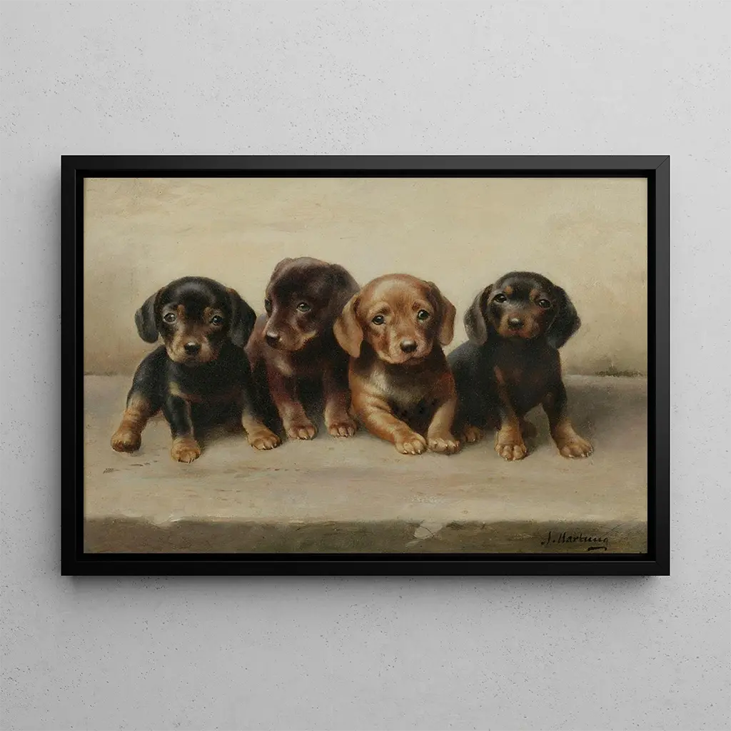 De kunstdruk van "Vier teckelpuppies" biedt een ontroerende blik op deze schattige kleine honden. Carl Reichert, met een onmiskenbaar talent voor het vastleggen van de onschuld en nieuwsgierigheid van dieren, presenteert deze puppies in een natuurlijke, levendige houding. De warme kleuren en de minutieuze details van hun vacht voegen toe aan de zachtheid van de scène, terwijl de glanzende ogen van de puppies ons uitnodigen om hun vreugde te delen. Dit werk roept een gevoel op van eenvoudige geluk en verbondenheid tussen mens en dier.