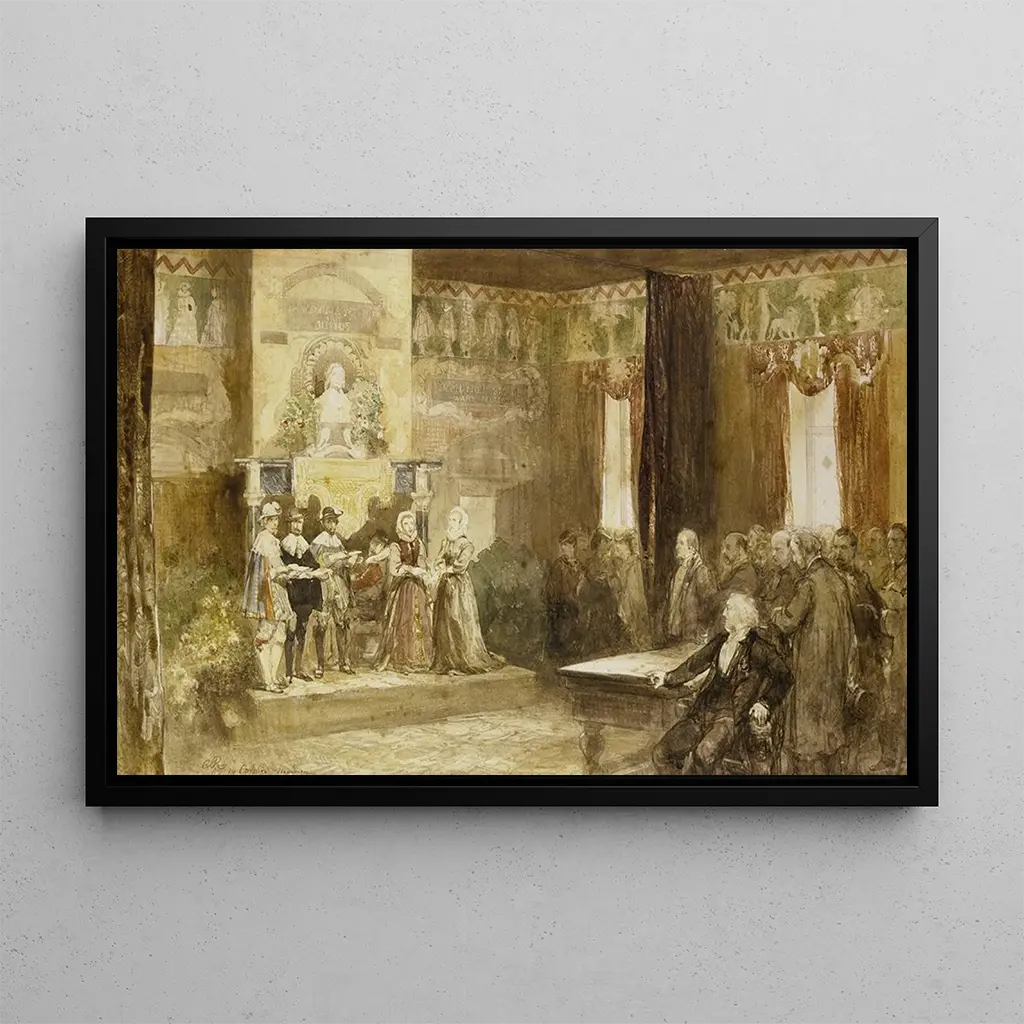 Celebratie van Vondel in het Muiderslot 1867: een eerbetoon aan poëzie en de natuur Deze boeiende kunstdruk, Celebratie van Vondel in het Muiderslot, beeldt een levendig en feestelijk tafereel af in het hart van een idyllisch Nederlands landschap. De sprankelende kleuren, variërend van weelderig groen tot diepe blauwtinten van de hemel, creëren een vrolijke en uitnodigende sfeer. De techniek van Charles Rochussen, die realisme combineert met een romantische toets, laat de energie van de viering voelen terwijl hij de natuurlijke schoonheid van het Muiderslot benadrukt. De personages, gekleed in historische kostuums, lijken te dansen en te interageren, waardoor de scène levendig en dynamisch wordt, bijna alsof je de lachende stemmen en gezangen kunt horen. Charles Rochussen: een meester van het Nederlandse landschap van de 19e eeuw Charles Rochussen, geboren in 1814, was een Nederlands kunstenaar bekend om zijn landschappen en historische scènes. Geïnspireerd door het romantisme, wist hij de essentie van de natuur en het dagelijks leven van zijn tijd vast te leggen. Zijn werk weerspiegelt een periode waarin de Nederlandse kunst zich heruitvindt, waarbij traditie en moderniteit samenkomen. Rochussen werd ook geïnspireerd door dichters en schrijvers, met name Joost van den Vondel, wiens werk hij vierde door middel van schilderkunstige composities. Zijn artistieke nalatenschap blijft belangrijk, omdat hij heeft bijgedragen aan de vormgeving van de perceptie van het landschap in de Nederlandse kunst. Een decoratief stuk met vele voordelen De kunstdruk van Celebratie van Vondel in het Muiderslot is een decoratief stuk dat elke ruimte kan verrijken, of het nu een woonkamer, kantoor of slaapkamer is. De kwaliteit van de afdruk en de trouw aan het originele werk garanderen een uitzonderlijke esthetische uitstraling. Door dit schilderij in uw inrichting te integreren, brengt u een vleugje geschiedenis en cultuur binnen, terwijl u een warme en gastvrije sfeer creëert. Deze kunstdruk, met zijn levendige kleuren en feestelijke sfeer, trekt de aandacht en wekt bewondering, waardoor het een ideale keuze is voor liefhebbers van kunst en schoonheid.