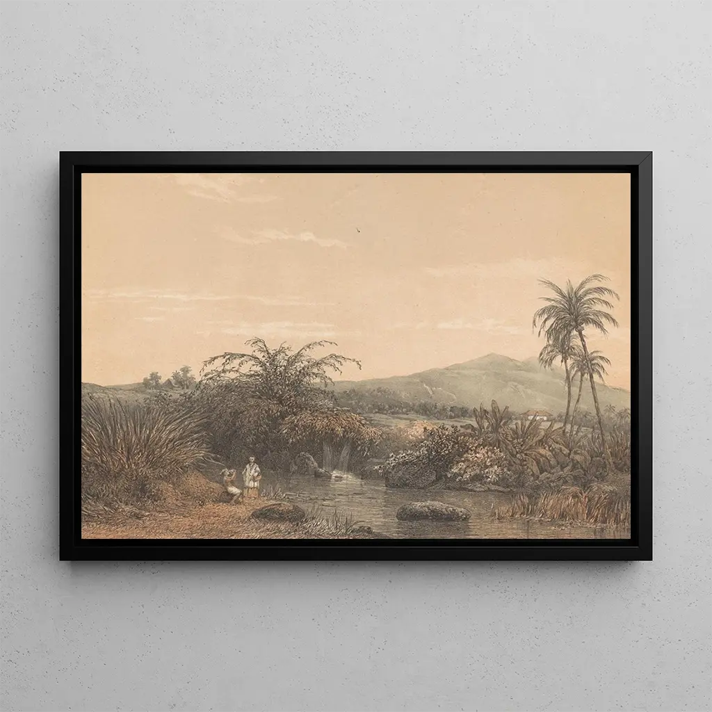 Vue sur Tjileboet : een betoverend landschap uit Indonesië De "Vue sur Tjileboet" van Johan Conrad Greive brengt de kijker naar het hart van een weelderig Indonesisch landschap. Dit schilderij, rijk aan details, beeldt een scène uit waarin de natuur in al haar pracht bloeit. De levendige groene tinten van de bladeren mengen zich met de zachte nuances van de lucht, waardoor een sfeer van vrede en harmonie ontstaat. De techniek van Greive, die realisme combineert met impressionistische accenten, laat de warmte en vochtigheid van deze idyllische plek voelen. Dit kunstwerk nodigt uit tot een zintuiglijke ontsnapping, waarbij elke blik een nieuw facet van dit betoverende landschap onthult. Johan Conrad Greive : een getuige van het Oosten Johan Conrad Greive, Nederlandse schilder uit de 19e eeuw, is vooral bekend om zijn exotische landschappen, met name die van Indonesië. Zijn werk past binnen een context waarin het Oosten de Europese kunstenaars fascineerde, aangetrokken door de landschappen en cultuur. Greive wist de essentie van deze verre plaatsen vast te leggen, beïnvloed door reizen en de verhalen van zijn tijdgenoten. Zijn schilderijen, zoals "Vue sur Tjileboet", getuigen van een bijzondere gevoeligheid voor de natuur en het licht, en onthullen een wereld die zowel mysterieus als toegankelijk is. Zijn artistieke nalatenschap blijft kunstenaars en kunstliefhebbers wereldwijd inspireren. Een decoratief kunstwerk met vele voordelen De kunstdruk van de "Vue sur Tjileboet" is een decoratief stuk dat elke ruimte kan verfraaien, of het nu in een woonkamer, slaapkamer of kantoor is. De kwaliteit van de reproductie en de trouw aan de originele kleuren maken het een ideale keuze voor wie een vleugje exotisme aan zijn inrichting wil toevoegen. Dit doek, met zijn rustige en rustgevende sfeer, nodigt uit tot dromen en ontsnapping. Door dit kunstwerk in uw ruimte te integreren, creëert u een warme en inspirerende atmosfeer, terwijl u tegelijkertijd hulde brengt aan de kunst van Greive en de schoonheid van Indonesische landschappen.
