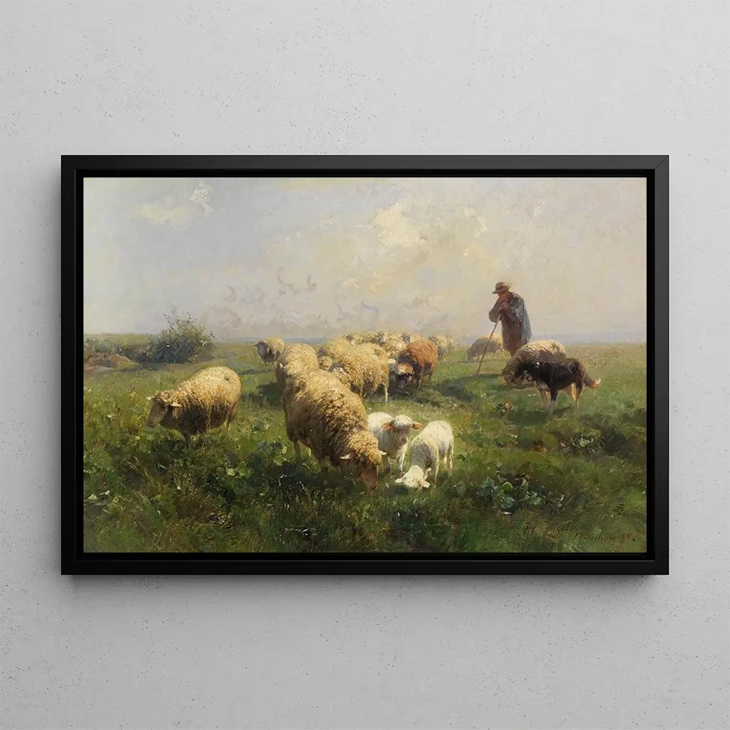 Heinrich von Zügel, een Duitse schilder uit de 19e eeuw, wordt erkend om zijn weergaven van de natuur en dieren. Geïnspireerd door de romantische beweging, wist hij de harmonie tussen mens en natuur vast te leggen. Zijn carrière beslaat meerdere decennia, waarin hij een unieke stijl ontwikkelde die precisie en poëzie combineert. Zügel werd ook beïnvloed door zijn reizen door Europa, wat zijn palet en artistieke visie verrijkte. Zijn kunstwerk "zonnig weiland" getuigt van zijn talent om landelijke scènes te vereeuwigen, waardoor hij een onmisbare figuur is geworden in de dierenkunst.