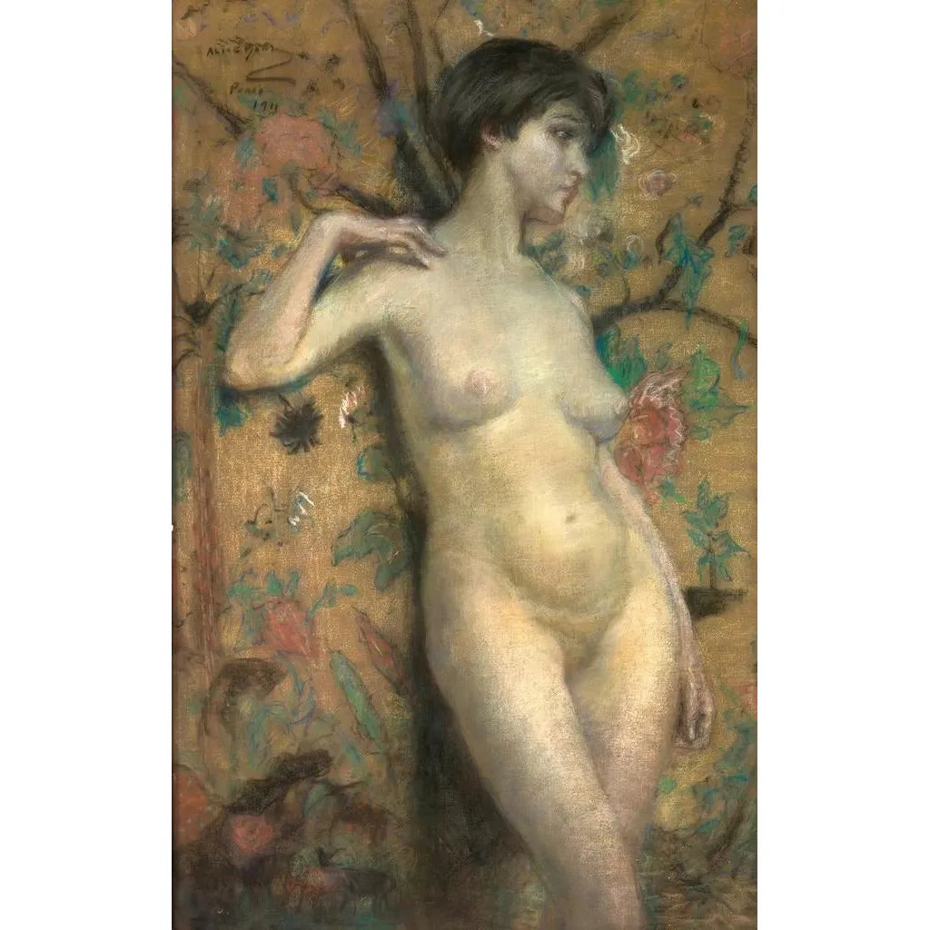 In de kunstdruk van Nu devant un paravent dompelt Alice Pike Barney ons onder in een wereld van verfijning en sensualiteit. De compositie benadrukt een vrouwelijke figuur, gracieus geposeerd voor een rijkelijk versierde paravent, wat een opvallend contrast creëert tussen naaktheid en ornamentatie. De zachte kleuren en het spel van licht accentueren de kromming van het lichaam, terwijl de getextureerde achtergrond een dromerige en mysterieuze sfeer oproept. De techniek van de kunstenaar, die realisme en impressionisme combineert, laat de warmte van de scène voelen, alsof men getuige is van een gestolen moment van intimiteit.