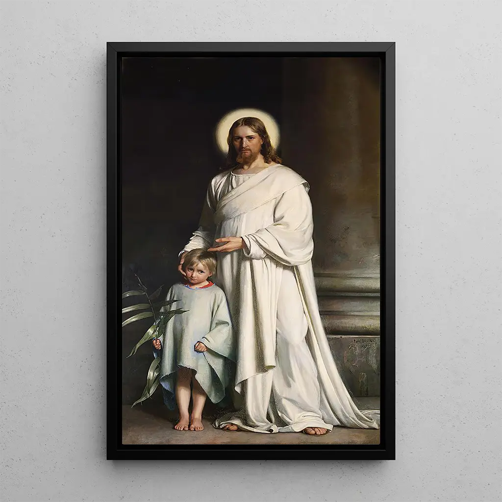 In dit ontroerende werk legt Carl Bloch een moment van zachtheid en sereniteit vast. Het schilderij toont Christus, omgeven door zacht licht, terwijl hij een klein kind zegent. De pastelkleuren en de delicate nuances van de huid voegen een warme dimensie toe aan de scène. De techniek van de kunstenaar, die realisme en idealisering combineert, creëert een sfeer doordrenkt van vrede en mededogen. De minutieuze details van de uitdrukkingen en gebaren versterken de emotie, en nodigen de kijker uit om de spirituele verbinding tussen Christus en het kind te voelen.