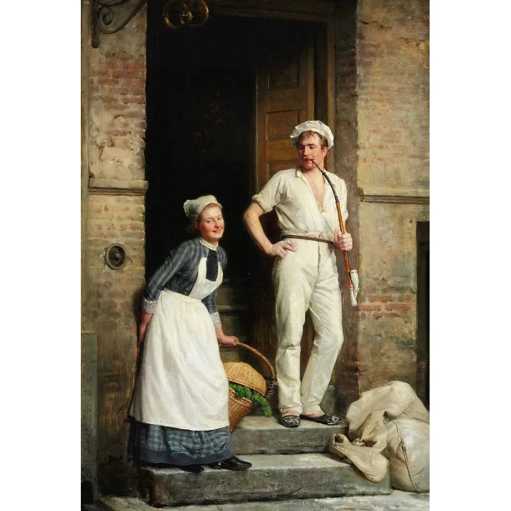 Carl Bloch, een iconisch figuur in de Deense schilderkunst, wist scènes uit het dagelijks leven te vereeuwigen met een unieke gevoeligheid. Actief in de 19e eeuw, werd hij beïnvloed door romantiek en realisme, wat hem in staat stelde werken te creëren die zowel toegankelijk als diep menselijk zijn. Zijn weergaven van het dagelijks leven, zoals die van de bakker, getuigen van zijn interesse in de kleine verhalen die het grote verhaal van de Deense samenleving vormen. Bloch wist een verbinding te leggen tussen kunst en leven, waardoor zijn werken tijdloos en universeel zijn.
