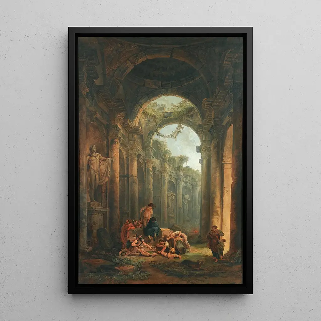 Ruïnes klassiekers met spelende soldaten: een echo uit het verleden Deze fascinerende kunstdruk van Hubert Robert, "Ruïnes klassiekers met spelende soldaten", brengt ons in een wereld waar geschiedenis en spel samenkomen. De majestueuze ruïnes, overblijfselen van een vervlogen tijdperk, dienen als achtergrond voor een levendige scène waarin soldaten, volop in activiteit, zich bezighouden met kinderspel. Het zachte licht dat de scène baden, evenals de warme kleuren, creëren een sfeer die zowel nostalgisch als vrolijk is. De compositie, evenwichtig en dynamisch, nodigt de kijker uit om de architectonische details te verkennen terwijl hij zich verdiept in de interactie tussen de personages, waardoor een speelse kant van de geschiedenis wordt onthuld. Hubert Robert: de kunstenaar van dromen en herinneringen Hubert Robert, iconisch figuur van de achttiende eeuw, wordt erkend om zijn vermogen om het echte en het denkbeeldige te combineren. Opgeleid aan de Koninklijke Academie voor Schilderkunst en Beeldhouwkunst, laat hij zich inspireren door grote Italiaanse meesters om zijn eigen stijl te ontwikkelen. Zijn kunstwerken, vaak bevolkt door ruïnes en geïdealiseerde landschappen, weerspiegelen een sterke interesse in de Oudheid en de natuur. Als hofschilder wist hij de geest van zijn tijd vast te leggen, waarbij hij de schoonheid van landschappen moeiteloos combineerde met scènes uit het dagelijks leven. Zijn artistieke nalatenschap blijft bestaan en getuigt van het belang van verbeelding in de kunst. Een decoratieve aankoop met vele voordelen De kunstdruk van "Ruïnes klassiekers met spelende soldaten" is een perfecte keuze om uw interieur te verrijken. Of het nu in een woonkamer, kantoor of slaapkamer is, dit doek brengt een vleugje elegantie en geschiedenis in uw ruimte. De kwaliteit van de afdruk en de trouw aan het originele kunstwerk garanderen een indrukwekkend visueel resultaat. Door dit schilderij in uw decor te integreren, geeft u uw omgeving een artistieke dimensie die zowel de schoonheid van de antieke ruïnes als de lichtheid van het spel oproept, waardoor een harmonieuze en inspirerende sfeer ontstaat.