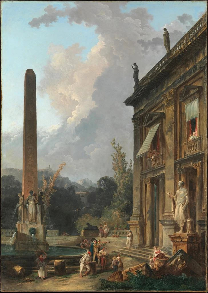 Hubert Robert, Franse schilder uit de achttiende eeuw, staat bekend om zijn romantische landschappen en scènes van antieke ruïnes. Geïnspireerd door de neoclassicistische beweging, wist hij de essentie van de natuur vast te leggen terwijl hij fantasie-elementen integreerde. Zijn carrière, gekenmerkt door reizen naar Rome en ontmoetingen met gerenommeerde kunstenaars, stelde hem in staat een unieke stijl te ontwikkelen, die het sublieme en het pittoreske combineert. "Ménestrels errants" past binnen een periode waarin de kunstenaar de thema's melancholie en nostalgie verkent, en getuigt van zijn interesse in de menselijke natuur en emoties.