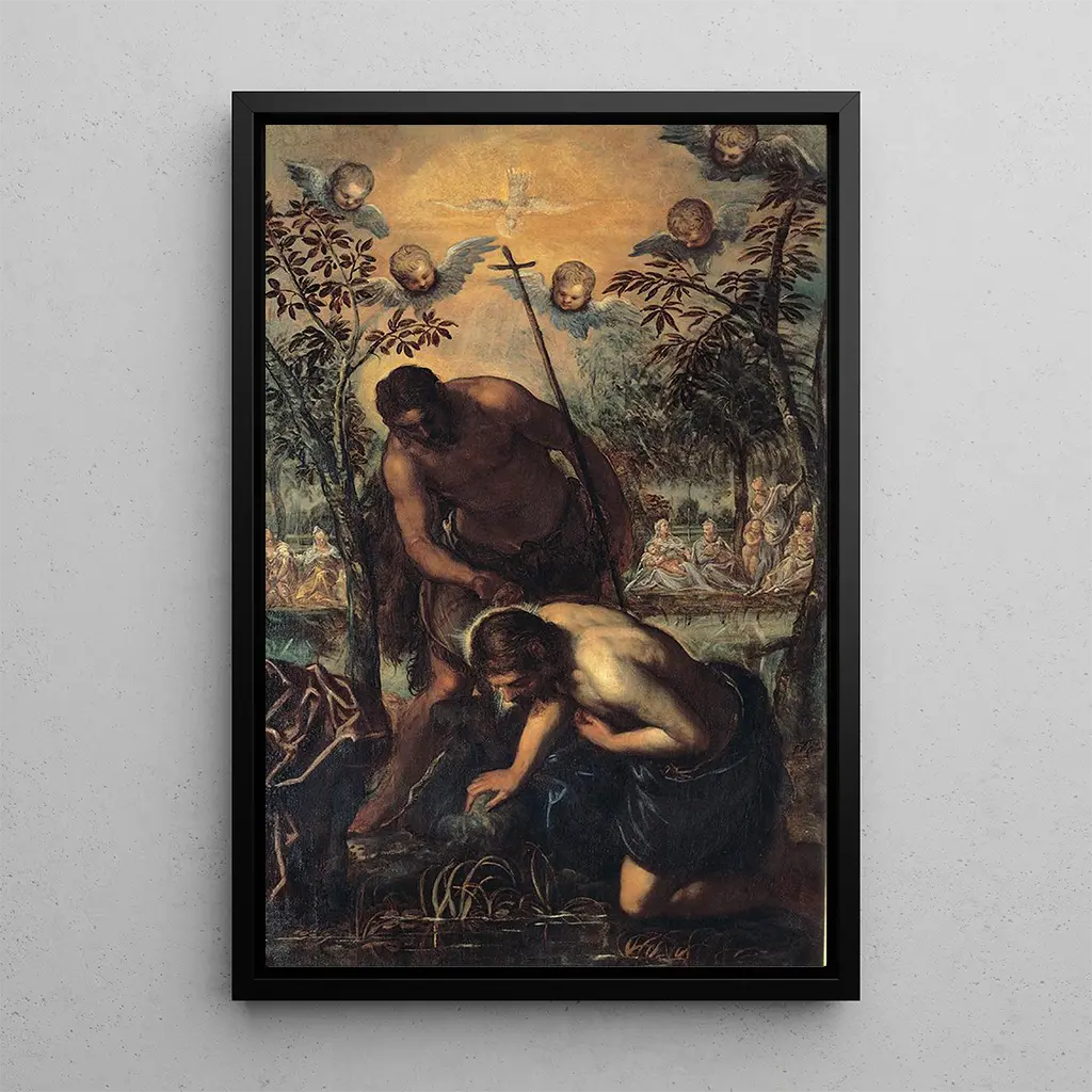 Jacopo Tintoretto, figure majeure de la Renaissance vénitienne, est reconnu pour sa capacité à allier tradition et innovation. Formé dans l'atelier de Titien, il développe rapidement un style qui se démarque par son expressivité et sa maîtrise de la lumière. Tintoretto, dont la carrière s'étend sur près de cinquante ans, a su capturer des thèmes religieux avec une intensité dramatique, influençant de nombreux artistes ultérieurs. "Le Baptême du Christ" illustre parfaitement son talent pour représenter des scènes sacrées tout en insufflant une énergie vivante à ses personnages.