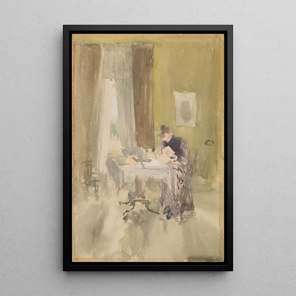 In het doek "Violet en amber thee" dompelt James Abbott McNeill Whistler ons onder in een delicate wereld waar nuances van violet en amber zich subtiel mengen. De compositie, zowel eenvoudig als verfijnd, roept een sfeer van sereniteit en contemplatie op. De vloeiende vormen en het spel van licht creëren een dialoog tussen schaduw en licht, en nodigen de kijker uit om zich onder te dompelen in deze intieme scène. De techniek van Whistler, gekenmerkt door delicate penseelstreken en een beperkte palet, geeft het kunstwerk een emotionele diepte die verder gaat dan het eenvoudige visuele.