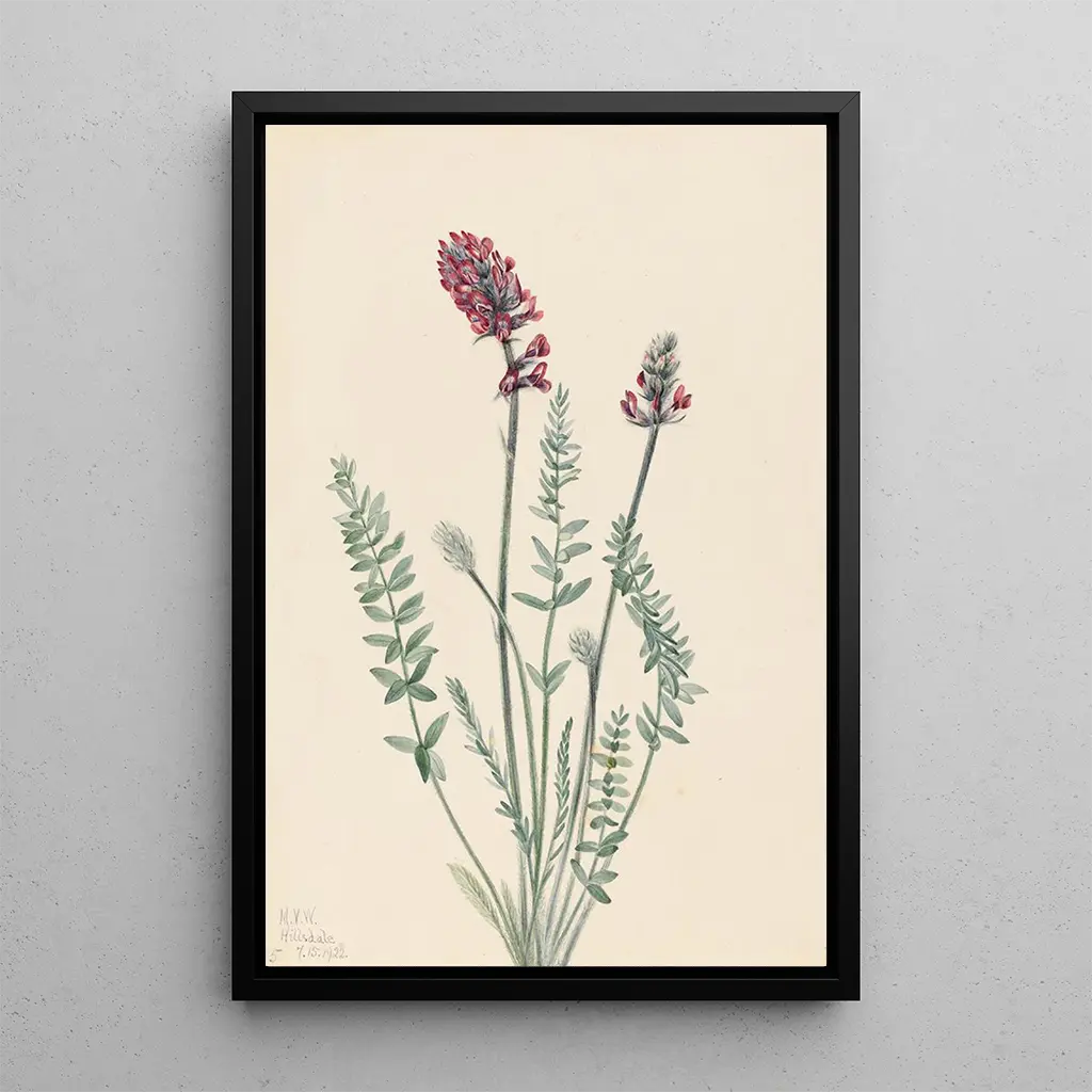 De kunstdruk "Oxytrope splendens" van Mary Vaux Walcott is een ware ode aan de delicate schoonheid van planten. Dit schilderij, rijk aan details, toont een harmonieuze compositie waarin elke bloem lijkt te vibreren onder het licht. De pastelkleuren, variërend van zacht roze tot frisse groen, roepen een zachte en rustgevende sfeer op. De aquareltechniek, beheerst door de kunstenaar, maakt het mogelijk om de transparantie van de bloemblaadjes en de fijnheid van de bladeren vast te leggen, waardoor een gevoel van lichtheid ontstaat. De kunstdruk nodigt de kijker uit om onder te dompelen in een bloemrijke wereld, waar elk element zorgvuldig is bestudeerd en met opmerkelijke precisie is weergegeven.