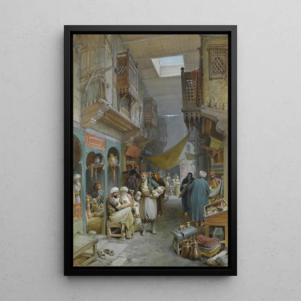 William Simpson, Britse kunstschilder en illustrator uit de 19e eeuw, staat bekend om zijn levendige weergaven van het oosterse leven. Onverzettelijke reiziger, hij wist de ziel van de landen die hij bezocht vast te leggen, met name Egypte en het Midden-Oosten. Zijn stijl, beïnvloed door het realisme en het impressionisme, onderscheidt zich door een bijzondere aandacht voor details en een palet van levendige kleuren. Simpson speelde een sleutelrol in de documentatie van oosterse culturen op een moment dat het Westen begon interesse te tonen in deze verre landen. Zijn kunstwerk, "Bazar Suez", getuigt van deze fascinatie en van zijn inzet om de culturele diversiteit van zijn tijd te vertegenwoordigen.