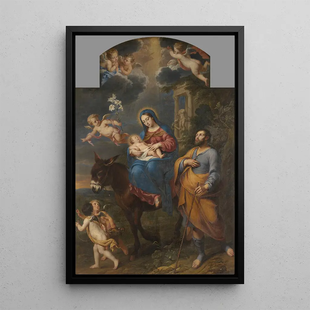 La Fuite en Égypte, œuvre de Marc Antonio Garibaldi, évoque un moment de tension et de sérénité où la lumière douce caresse les visages des personnages. Les couleurs chaudes, dominées par des tons dorés et terreux, créent une atmosphère à la fois apaisante et dramatique. La composition, centrée sur la Sainte Famille, nous invite à plonger dans une scène riche en émotions, où chaque détail raconte une histoire. Les gestes délicats et les expressions des personnages transmettent une profondeur spirituelle, tandis que le paysage environnant, avec ses nuances de vert et de bleu, suggère un voyage à travers des terres inconnues.
