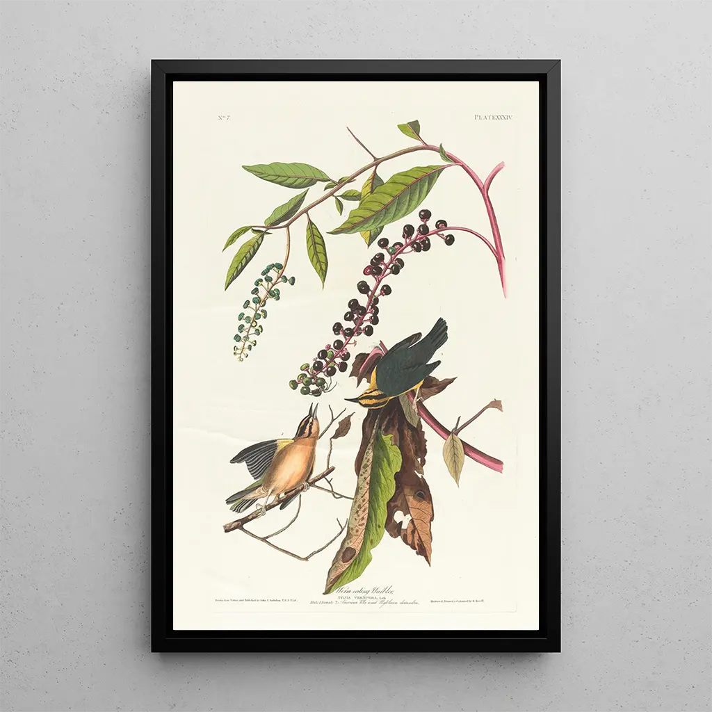 De kunstdruk van de Paruline vermivore, een iconisch werk van John James Audubon, vangt de schoonheid en de delicatesse van deze gekleurde vogel. Met zijn levendige verenkleed, dat schommelt tussen felgeel en zachte groen, roept dit doek een sfeer van lentefrisseur op. Audubon, meester in de kunst van observatie, heeft gravure- en aquarelltechnieken gebruikt om dit schepsel tot leven te brengen. Elk detail, van de veren tot de heldere ogen, wordt zorgvuldig weergegeven, waardoor de kijker wordt uitgenodigd om onder te dompelen in de natuurlijke wereld. Het werk, zowel realistisch als poëtisch, herinnert ons aan de rijkdom van de biodiversiteit.