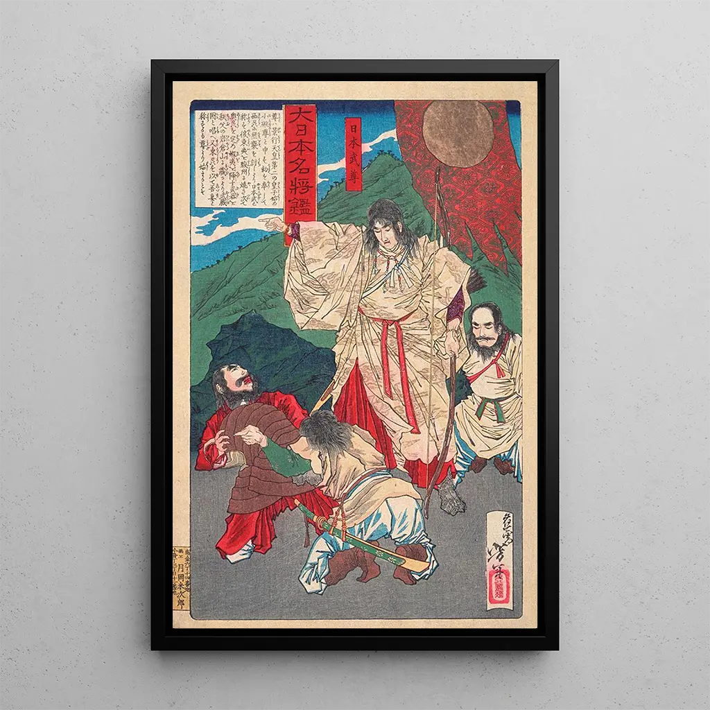 In deze betoverende kunstdruk wordt Yamato Takeru no Mikoto afgebeeld in al zijn glorie, terwijl hij zijn boog vasthoudt met een voelbare vastberadenheid. De levendige kleuren en de minutieuze details van zijn harnas roepen een sfeer van moed en mysterie op. De dynamische compositie trekt de aandacht en benadrukt de beweging van het personage, alsof hij zich voorbereidt op een episch avontuur. Tsukioka Yoshitoshi, meester van de Japanse ukiyo-e, slaagt erin de essentie van deze mythologische held vast te leggen, waarbij een gevechtsscène wordt omgevormd tot een levendig en evocatief kunstwerk.