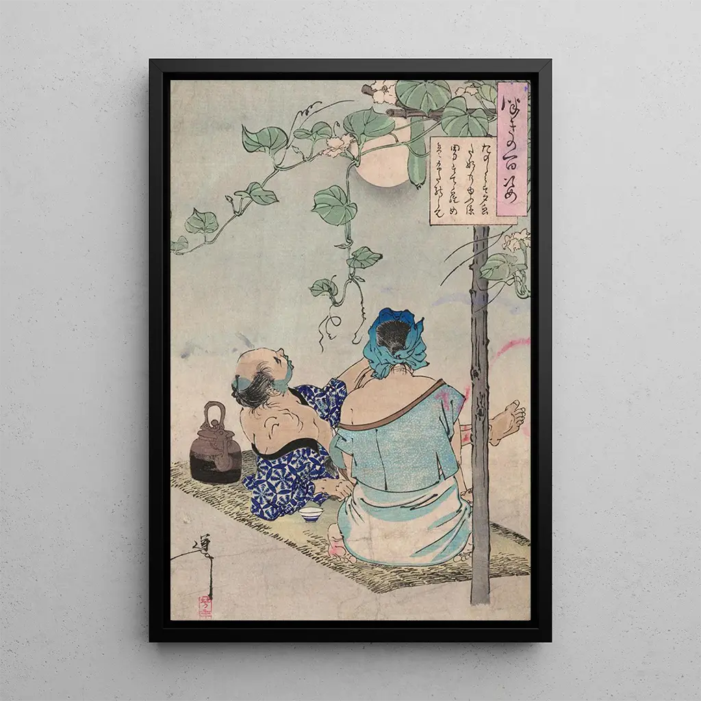 In de kunstdruk Ygao dana nry zu dompelt Tsukioka Yoshitoshi ons onder in een wereld waar schoonheid en melancholie samenkomen. De compositie is rijk aan details, elk personage zorgvuldig geplaatst om een boeiende dynamiek te creëren. De kleuren, zowel levendig als delicaat, roepen een dromerige sfeer op, terwijl de techniek van de Japanse ukiyo-e, met zijn vloeiende lijnen en subtiele nuances, de diepte van het kunstwerk versterkt. Dit schilderij nodigt uit tot contemplatie, en onthult langzaam zijn geheimen aan degenen die de tijd nemen om het te observeren.