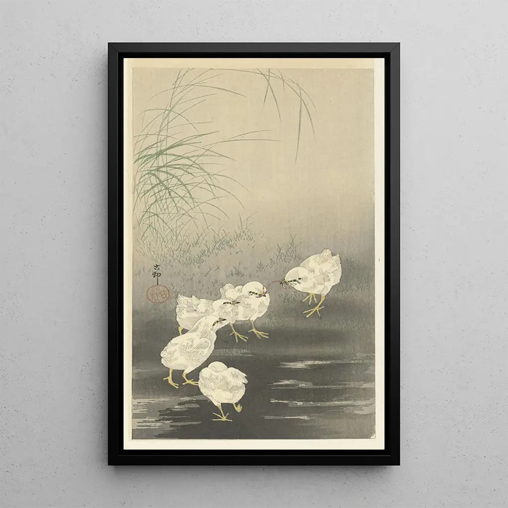 De kunstdruk van het werk "Poussins et ver" van Ohara Koson dompelt ons onder in een wereld vol zachtheid en sereniteit. De kuikens, afgebeeld met opmerkelijke precisie, lijken op te stijgen uit een vredige wereld, terwijl de larve, symbool van de natuur, harmonieus in deze scène wordt geïntegreerd. De pastelkleuren, gedomineerd door zachte tinten geel en groen, creëren een rustgevende sfeer. De houtgravure-techniek, kenmerkend voor de Japanse kunst, geeft dit doek een unieke, bijna tastbare textuur, die de kijker uitnodigt om zich onder te dompelen in deze delicate voorstelling van het wilde leven.