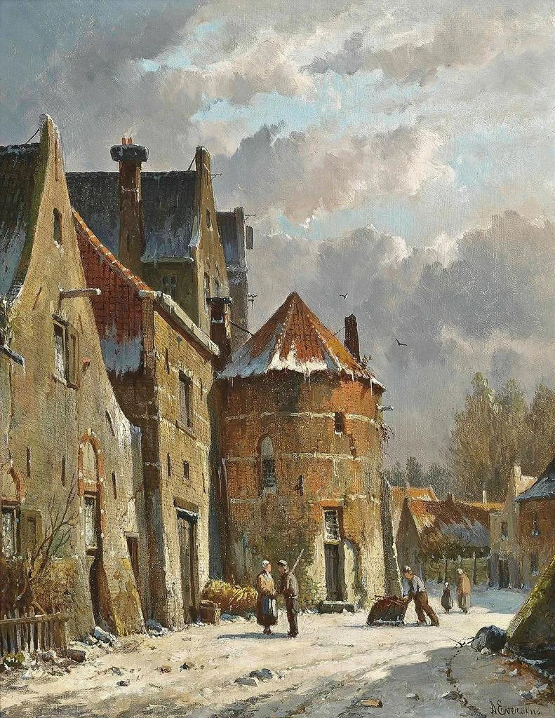 Kunstdruk | Personages dans une rue hollandaise en hiver - Adrianus Eversen