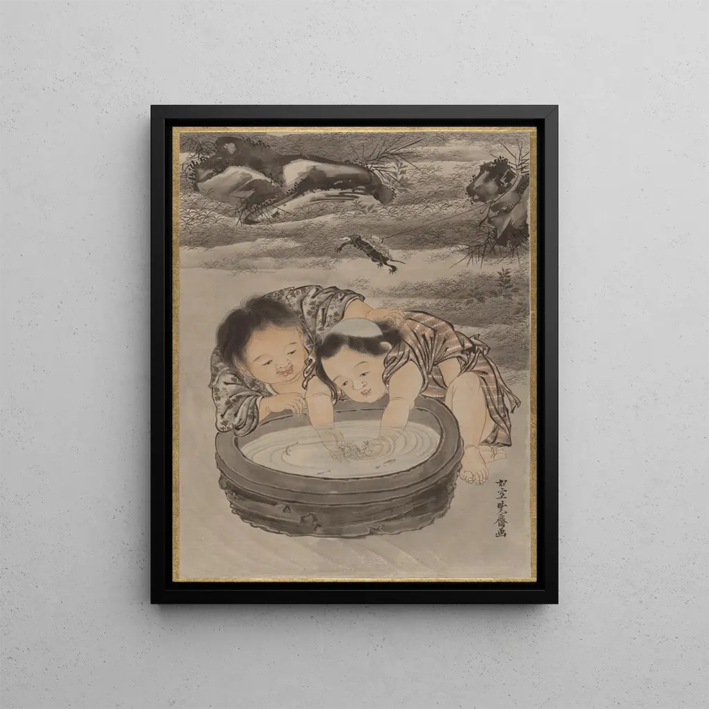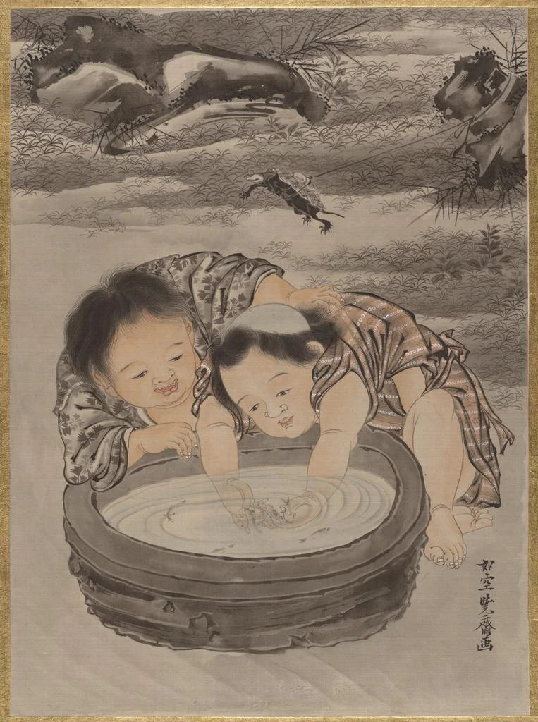 Deux enfants jouant avec des poissons rouges - Kawanabe Kyōsai