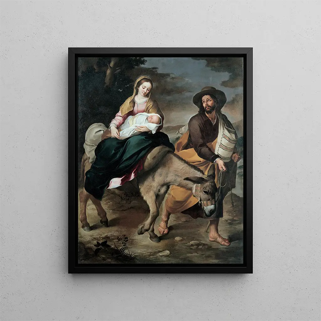 Reproduction La fuite en Égypte - Bartolomé Esteban Murillo – Introduction captivante La fuite en Égypte de Bartolomé Esteban Murillo est une œuvre qui transcende le simple cadre pictural pour plonger le spectateur dans une narration riche en émotions et en spiritualité. Cette peinture, emblématique du baroque espagnol, dépeint un moment crucial de l'Évangile, où la Sainte Famille, en proie à la persécution, trouve refuge en terre d'Égypte. Murillo, avec sa maîtrise des lumières et des ombres, parvient à capturer l'essence même de la protection divine, rendant cette scène à la fois accessible et profondément touchante. La reproduction de cette œuvre permet non seulement d'apprécier la virtuosité technique de l'artiste, mais aussi de s'imprégner de l'atmosphère sereine qui émane de la toile. Style et singularité de l’œuvre La finesse du style de Murillo se manifeste à travers sa palette de couleurs douces et ses compositions harmonieuses. Dans La fuite en Égypte, il utilise des teintes chaudes qui enveloppent les personnages d'une aura de tendresse et de sérénité. Les visages, délicatement modelés, expriment une gamme d'émotions allant de l'inquiétude à l'espoir, créant ainsi un lien émotionnel fort avec le spectateur. Les drapés des vêtements, soigneusement rendus, témoignent d'un savoir-faire exceptionnel, tandis que les détails naturels du paysage en arrière-plan ajoutent une dimension de réalisme à la scène. Ce tableau, par sa simplicité apparente, révèle une profondeur spirituelle qui invite à la contemplation et à la méditation. L’artiste et son influence Bartolomé Esteban Murillo, figure emblématique de l'art espagnol du XVIIe siècle, a su marquer son époque par son approche unique de la peinture religieuse. Influencé par les maîtres flamands, il développe un style qui allie réalisme et idéalisation, rendant ses œuvres accessibles à un large public. Sa capacité à capturer l'humanité des personnages saints, tout en conservant une dimension divine, lui confère une place de choix dans l'histoire de l'art. Murillo ne se contente pas de représenter des scènes bibliques ; il parvient à insuffler une vie et une émotion à ses sujets, ce qui a inspiré de nombreux artistes à travers les siècles. Sa contribution à l'art