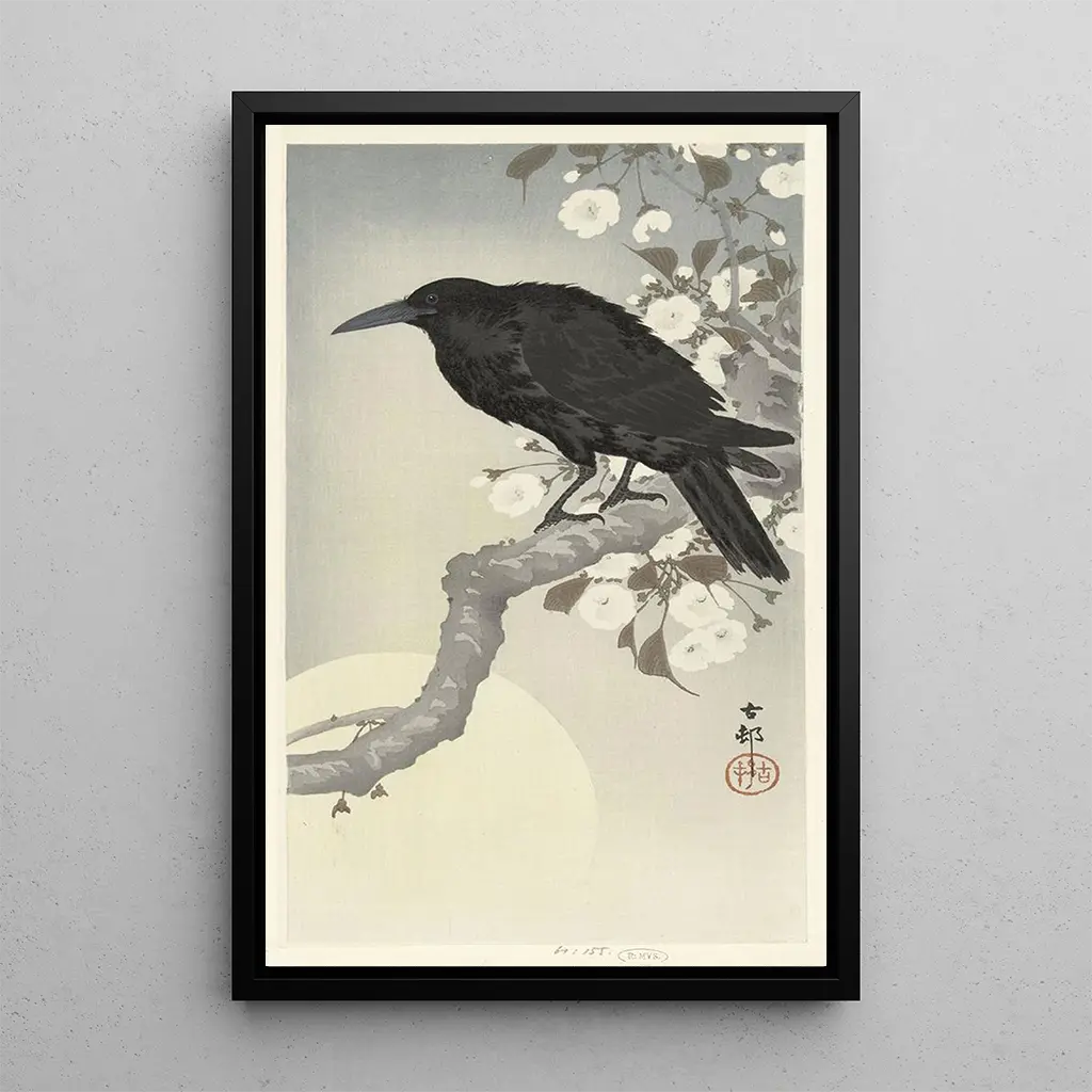 La reproduction "Corbeau à la pleine lune" d'Ohara Koson évoque une scène mystérieuse et poétique, où un corbeau se profile devant une lune éclatante. Les teintes sombres et les nuances argentées créent une atmosphère énigmatique, tandis que les détails délicats du plumage de l'oiseau ajoutent une dimension tactile à l'œuvre. Cette composition captivante invite le spectateur à plonger dans un monde nocturne, où la magie et la nature se rencontrent. La maîtrise de Koson dans l'utilisation de la lumière et de l'ombre fait de cette toile une véritable œuvre d'art à contempler.