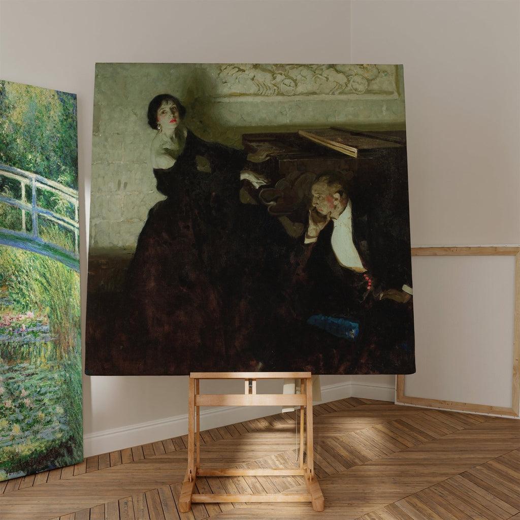 Découvrez l'œuvre Romantic Couple Seated by Piano, réalisée en 1922 par l'artiste américain Dean Cornwell. Cette pièce emblématique capture un moment d'intimité et de passion, tandis qu'un couple se perd dans la mélodie d'un piano. Cornwell, connu pour sa maîtrise technique et son sens de la couleur, apporte une profondeur émotionnelle à cette œuvre qui résonne avec quiconque apprécie la beauté des relations humaines.