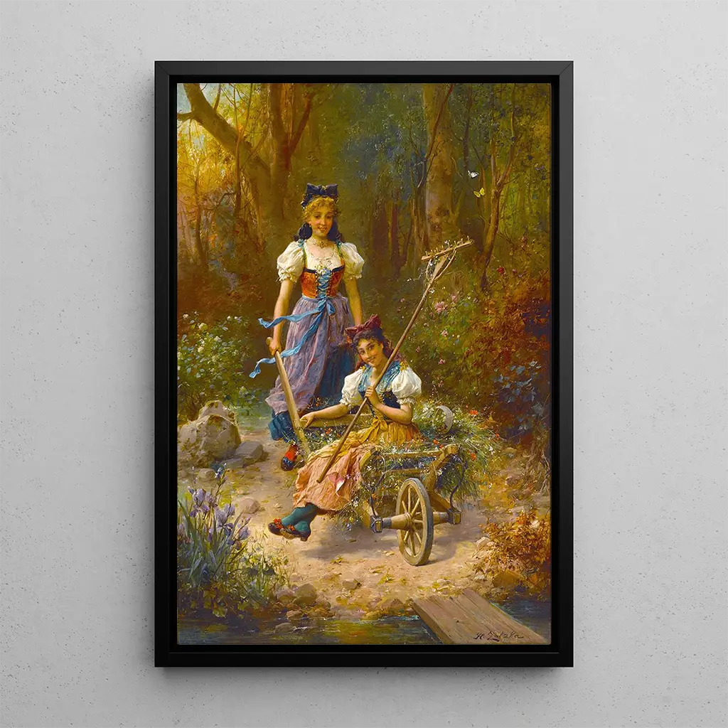 Dans "Voyage joyeux", Hans Zatzka nous plonge dans un univers enchanteur où la légèreté et la joie de vivre s'entremêlent. La composition, riche en couleurs pastel, évoque une scène bucolique où des personnages, vêtus de costumes d'époque, s'épanouissent dans un cadre idyllique. Les détails minutieux, typiques de la technique de Zatzka, apportent une profondeur à l'œuvre, tandis que la lumière douce illumine chaque élément, créant une atmosphère de rêve. Ce tableau invite à la contemplation et à l'évasion, offrant un moment de sérénité à ceux qui l'observent.