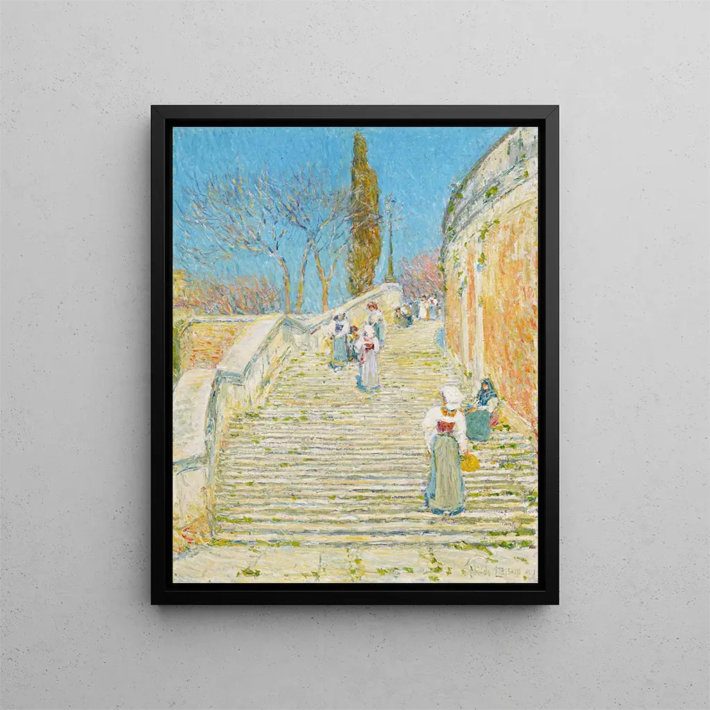 Le style de Childe Hassam se caractérise par une utilisation audacieuse de la couleur et de la lumière, créant ainsi une atmosphère unique qui fait de chaque tableau une expérience immersive. Dans "Place d'Espagne à Rome", l'artiste joue avec les contrastes et les harmonies chromatiques pour rendre compte de la vivacité de la scène. Les ombres dansantes des arbres, les reflets des façades et l'animation des passants sont autant d'éléments qui s'entrelacent dans une danse visuelle captivante. Hassam, maître de l'impressionnisme, parvient à capturer l'éphémère, à figer l'instant tout en laissant transparaître une sensation de mouvement perpétuel. Ce tableau est une ode à la beauté fugace de la vie citadine, où chaque élément contribue à une composition équilibrée et dynamique.